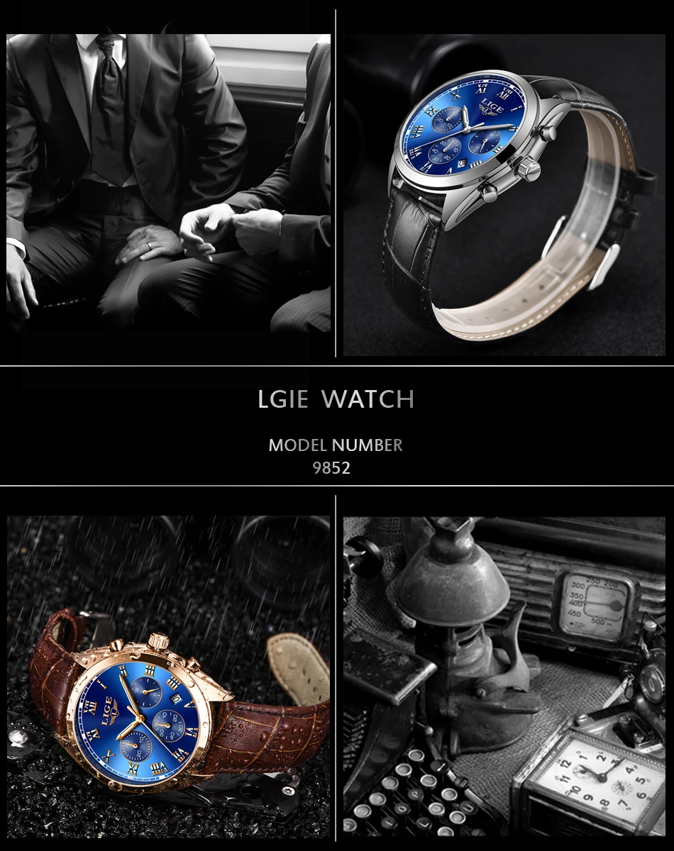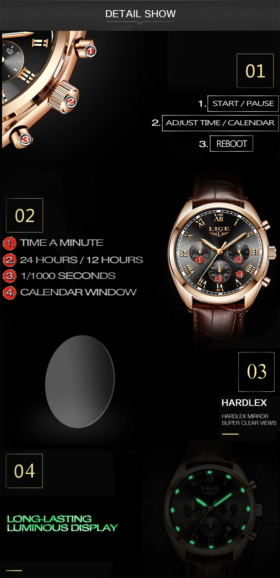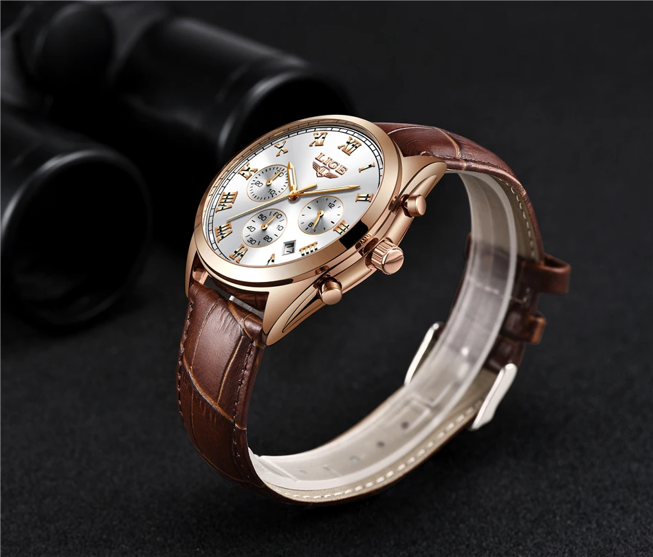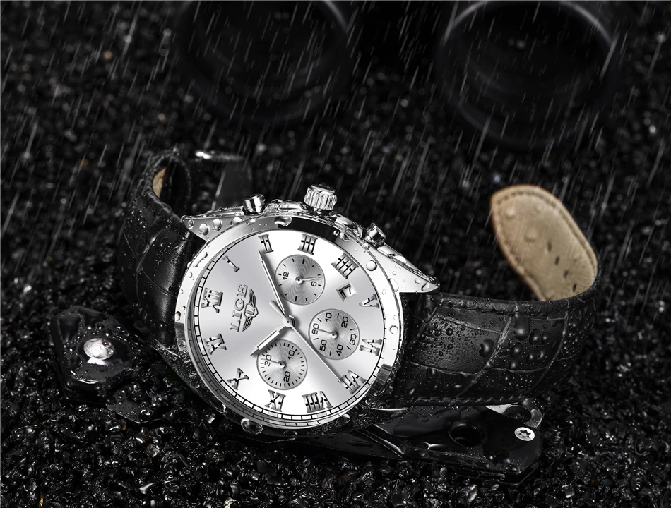 Часы наручные LIGE Мужские Спортивные кварцевые, роскошные брендовые многофункциональные водонепроницаемые деловые, с кожаным ремешком, с коробкой