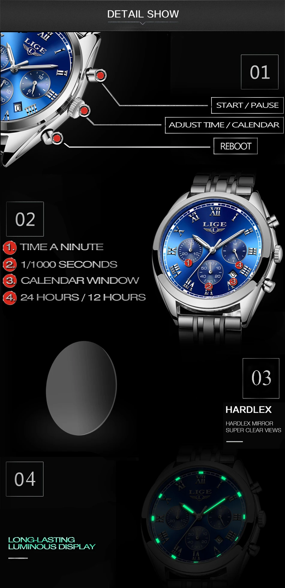 Часы наручные LIGE Мужские кварцевые, брендовые Роскошные модные по...