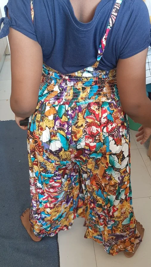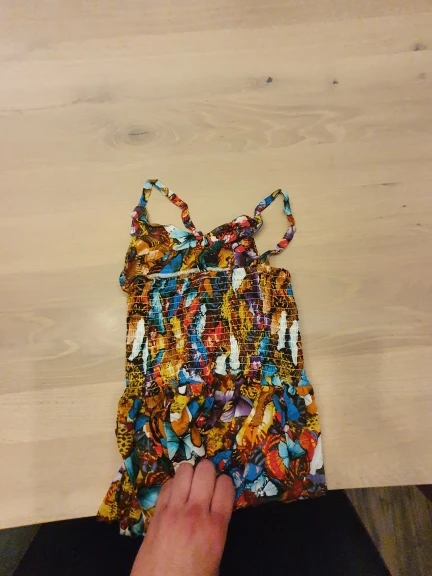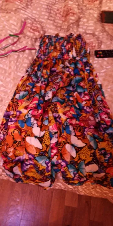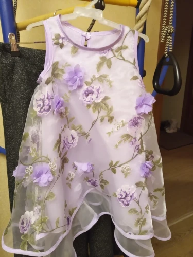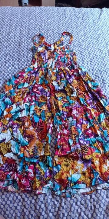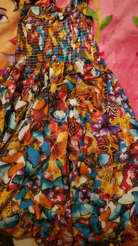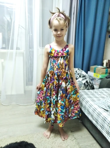 Яркий, красивый сарафан из хлопчатобумажной ткани (на фото вроде шифон). Заказывали с бабочками. Верх (лиф) узковат, - на фото у девочки широкий , а по факту очень узкий лиф. Если у девочки есть грудь, то может не прикрыть. а в общем мы довольны! Спасибо