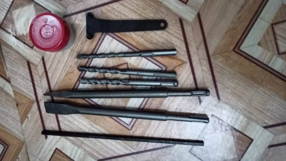 Доставка быстрая, продавец общительный, ответил на все вопросы. В комплекте 2 зубила, 3 сверла, смазка для редуктора, ключ смазочной крышки редуктора и пыльник. Вес перфоратора 8 кг, сборка качественная, на ручке предусмотрено гасение вибрации, шнур 2 метра мягкий, не дубеет при -10. 3 режима работы: удар, сверление + удар, сверление. Режим настраивается при помощью двух переключателей, есть регулировка скорости от 0 до 5, на ручке есть индикатор напряжения сети. Перфоратор позволяет сверлить подрозетники, при разумном использовании прослужит надолго. Покупал для использования в качесте отбойного молотка, со своей задачей справляется на ура, главное вибрации не передаются на руку благодаря солидному весу и удобным ручкам. Кейс пластиковый с металлическими защелками.