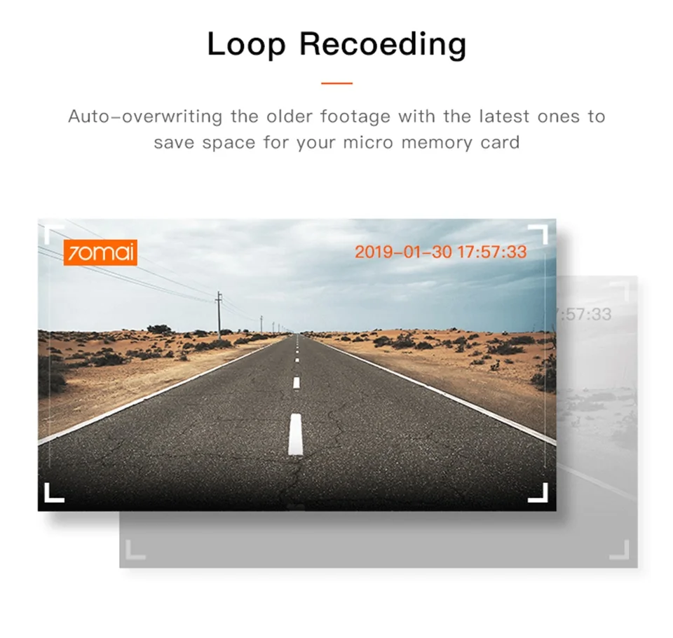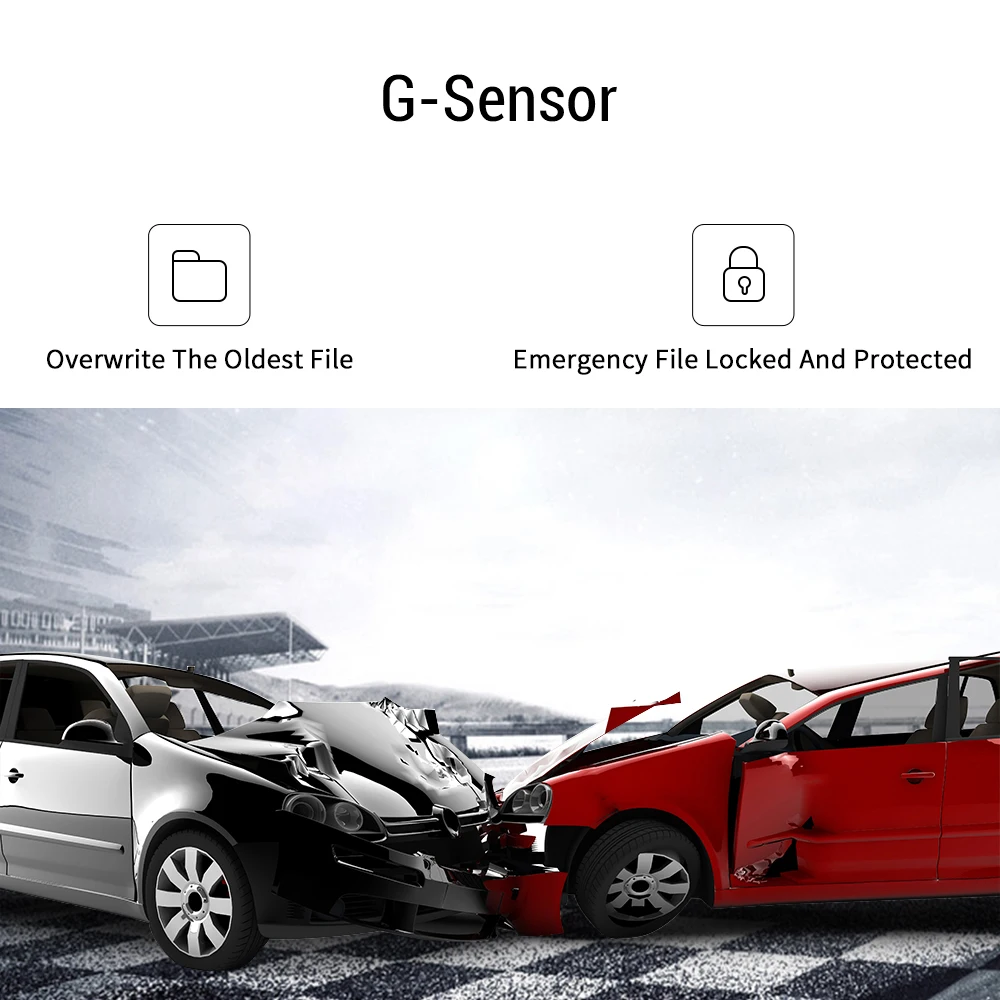 G-сенсор из-за технологии bulit-in G-sensor, 70mai dash cam может автоматически начать запись при столкновении. Запись заблокирована в случае, если файл отделен от обычного файла, чтобы избежать перезаписи. Датчик G срабатывает в результате события силы G, например удара или внезапного торможения. При обнаружении события камера автоматически записывает текущие кадры для сохранения и передачи голоса.