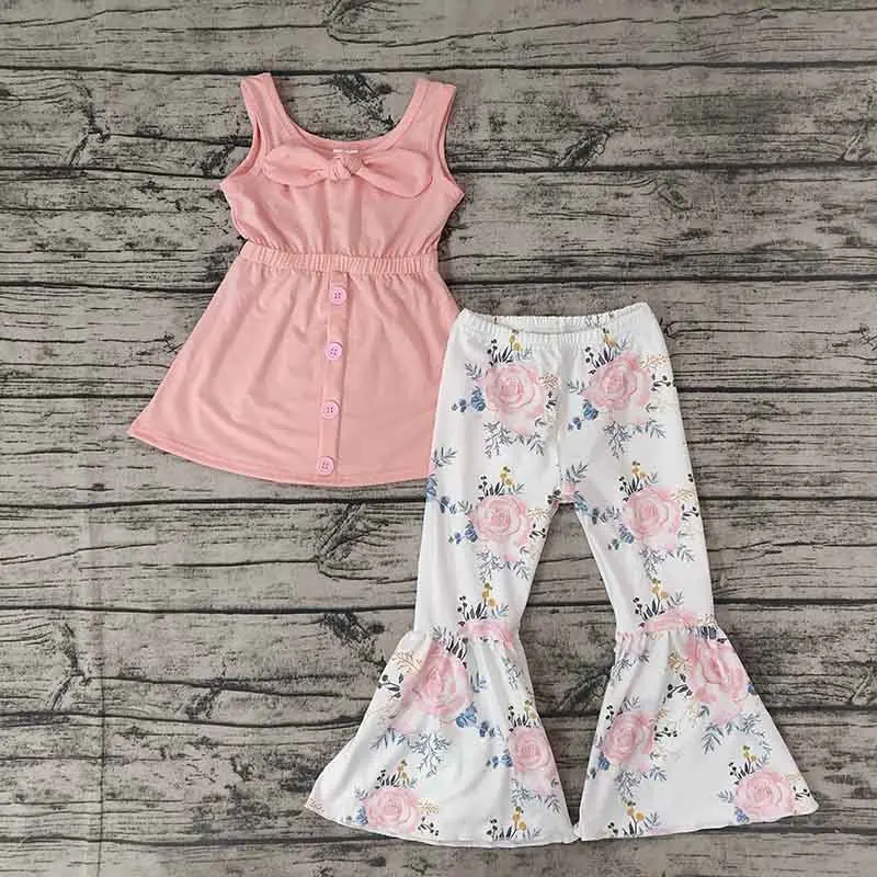 Оптовая продажа, комплект детской одежды, модное розовое платье-туника с бантом, штаны с цветочным принтом и колокольчиком, бутик одежды для маленьких девочек, детские наряды для младенцев
