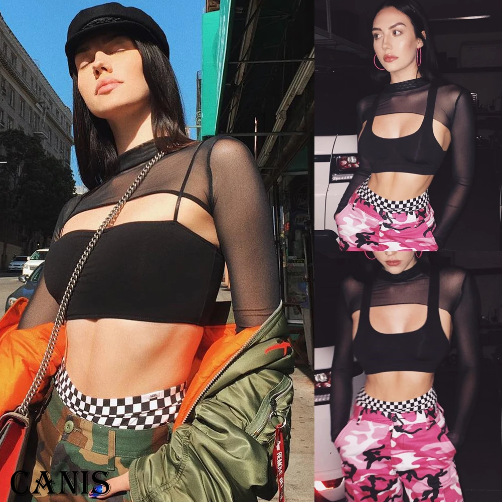 Женская сексуальная прозрачная Сетчатая футболка с длинным рукавом, повседневный Топ, Прозрачная черная сетчатая короткая футболка, облегающая Клубная одежда