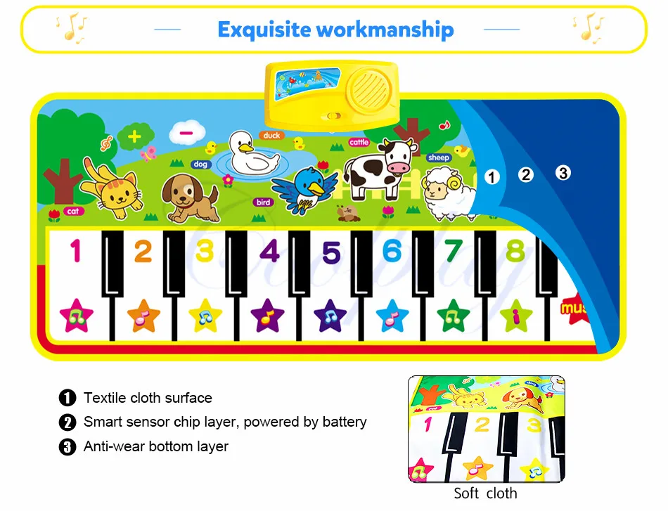 -Музыкальное одеяло имеет нескользящий слой. Но, пожалуйста, будьте осторожны при физических упражнениях на гладкой поверхности. -За Младенцами и малышами нужно следить родителям, чтобы избежать падения во время игры Коврик для пианино. -Пожалуйста, используйте цинк-марганцевые сухие батареи для этого музыкального коврика. Щелочная батарея может сжечь доску.