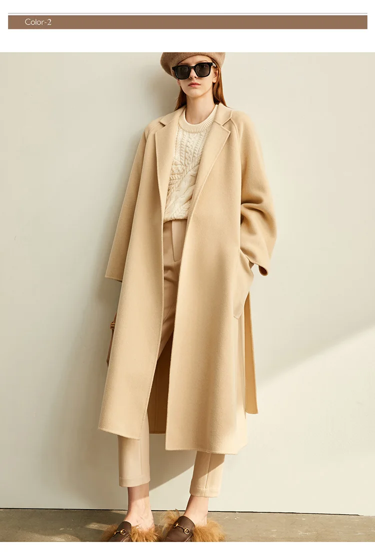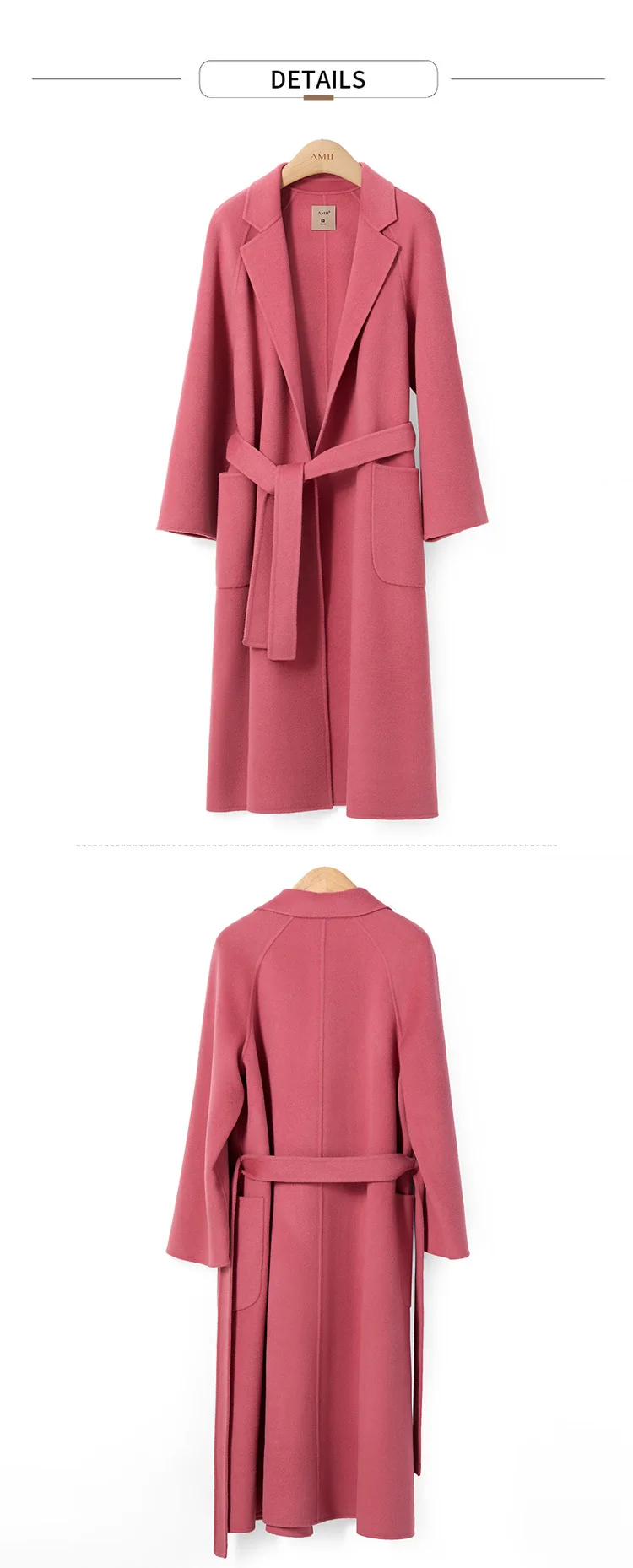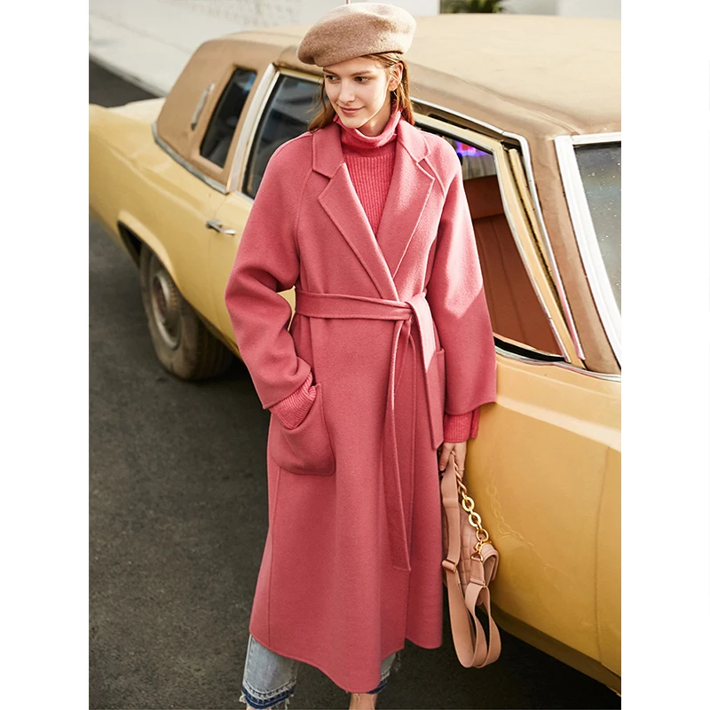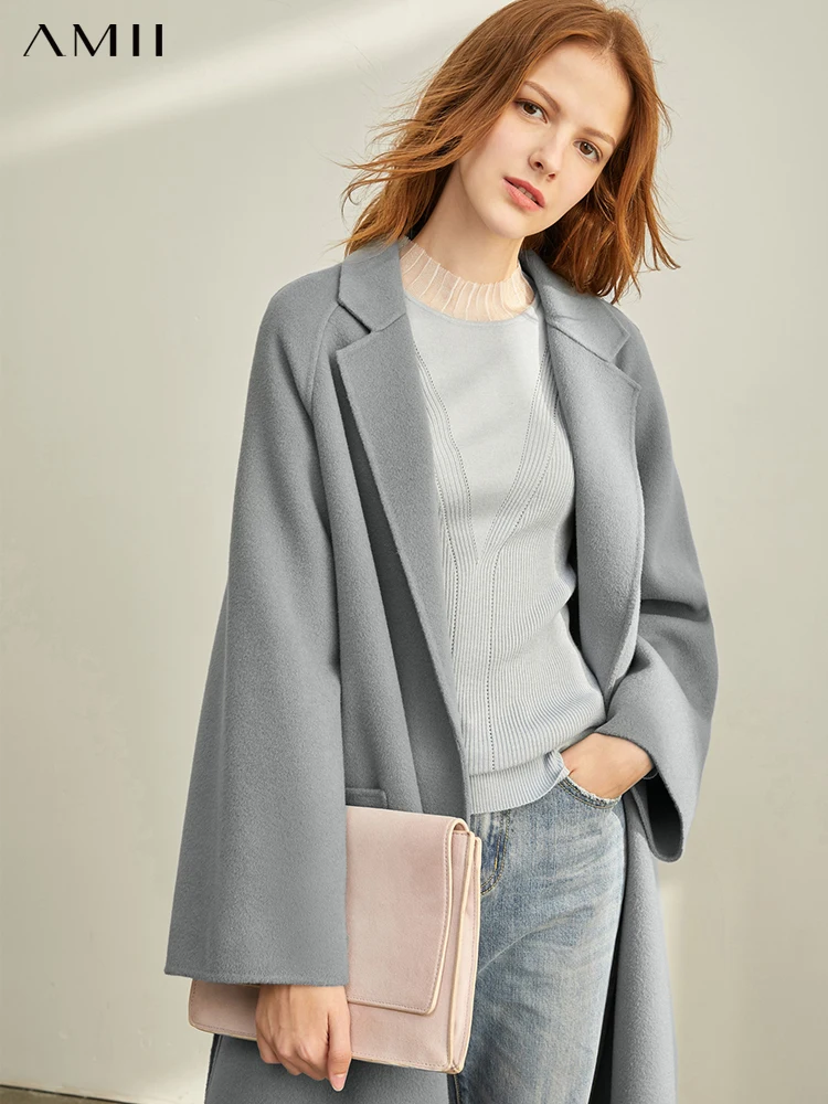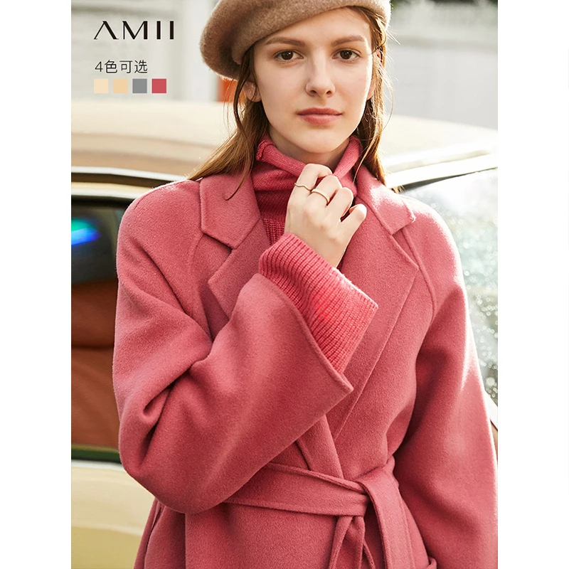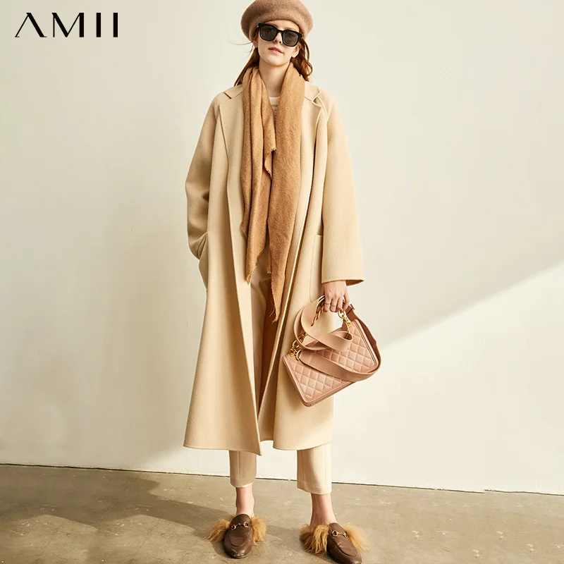 Amii минималистичное шерстяное пальто с лацканами Зимнее женское однотонное свободное с поясом Женское шерстяное длинное пальто двойное шерстяное пальто 11920291