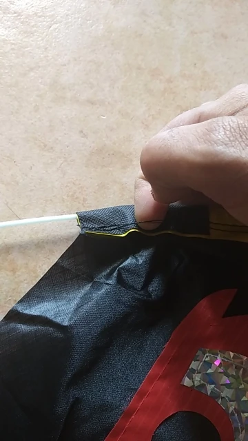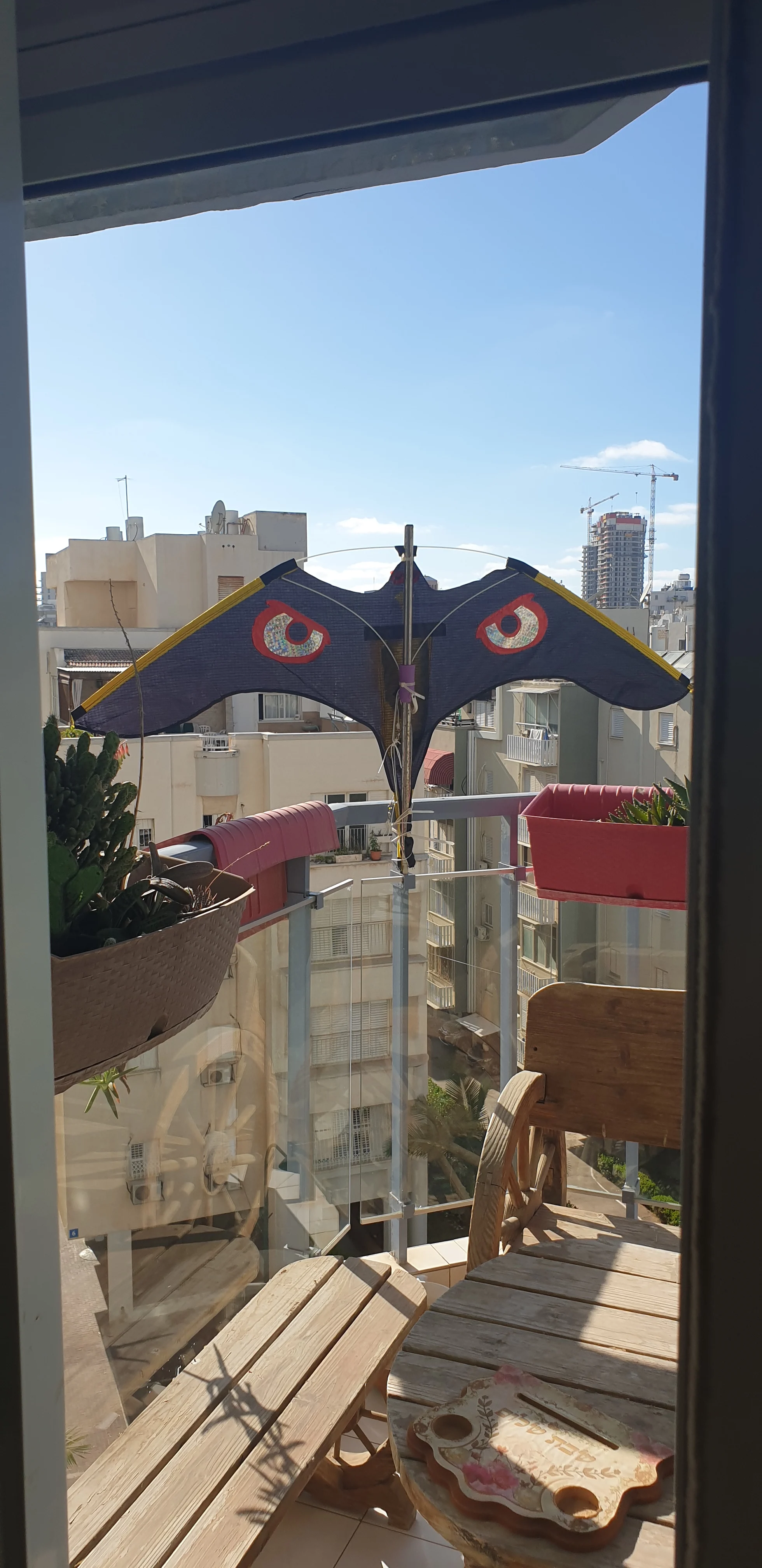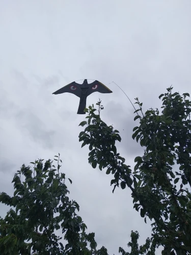 Я не был уверен, что это будет хорошо лететь, но это делает. Когда нет большого количества ветра, он все еще умудряется двигаться немного, так что он все еще держит голубей подальше. Когда он ветреный, он парит высоко и производит много шума. Выглядит как злой голубь. На данный момент выглядит крепким. Мы связываем его с длинной бамбуковой веткой вместо полюса.