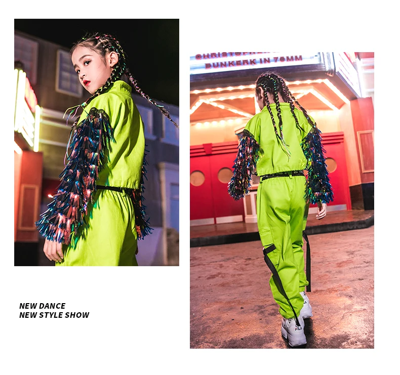 Флуоресцентный зеленый костюм для девочек в стиле хип-хоп, куртка с блестками, брюки, детская одежда для выступлений на сцене, для уличных танцев