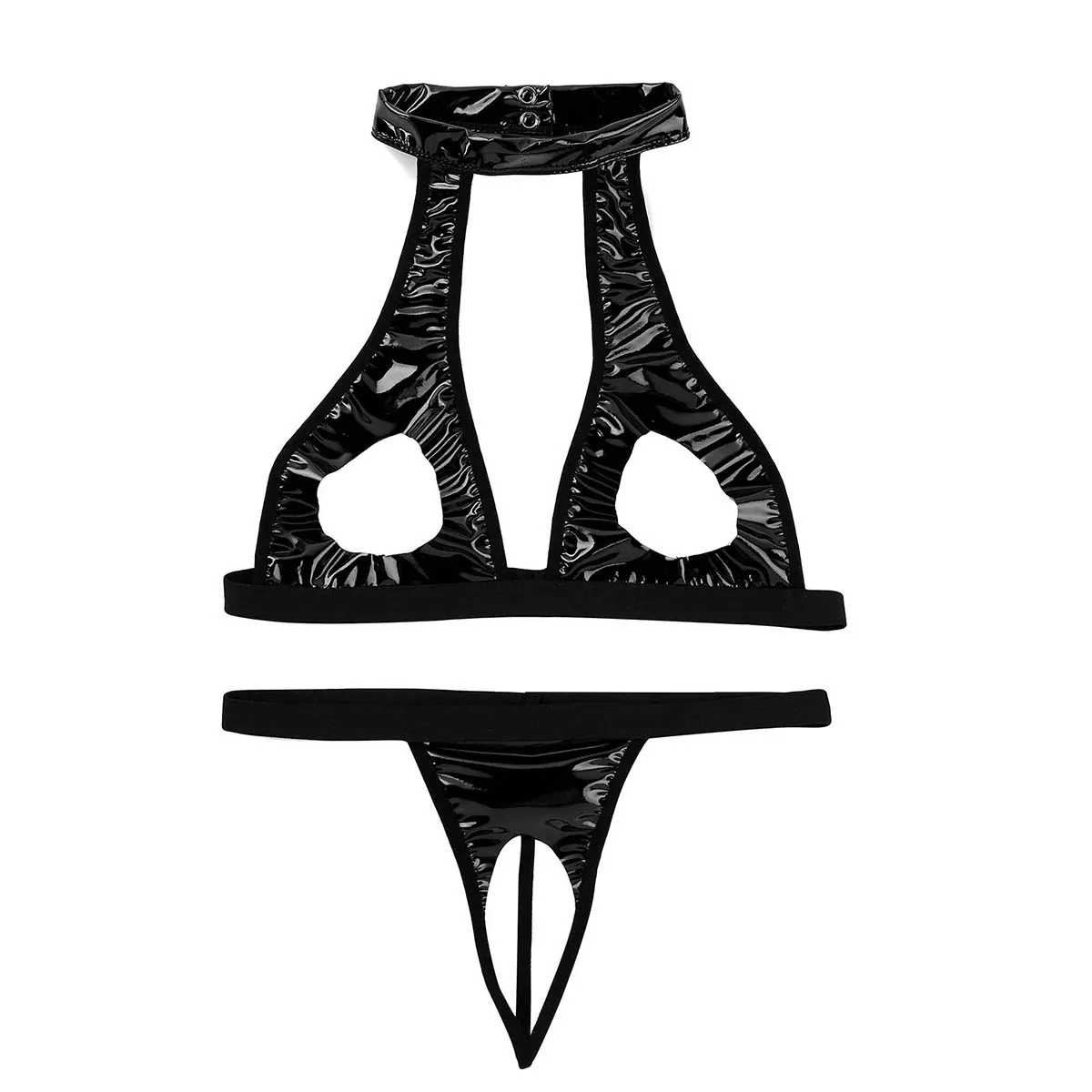 Особенности:Комплект женского нижнего белья из искусственной кожи wetlook из 2 предметов, удобная и эластичная ткань.Бюстгальтер с лямкой на шее и вырезом на груди; Топ без косточек; Трусы-стринги; Нижнее белье.Уникальный дизайн показывает ваши края и изгиб, сделает вас более привлекательной и очаровательной.Идеально подходит для Дня Святого Валентина, медового месяца, элегантный внешний вид делает вас более привлекательным для вашего партнера.Пожалуйста, проверьте размер перед покупкой, рекомендуется ручная стирка.