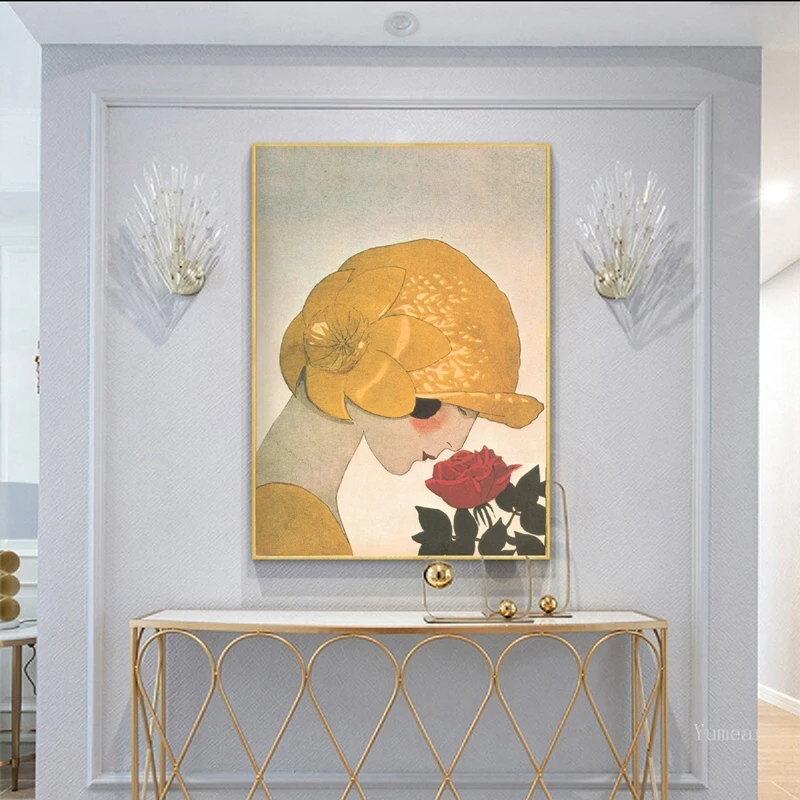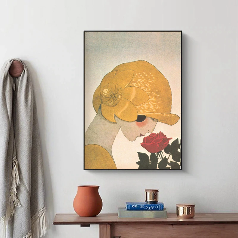 Винтажная иллюстрация девушка шляпа Роза Печать холст Vogue Обложка художественный постер Андрэ Марти художественная живопись картина домашний Декор стены комнаты