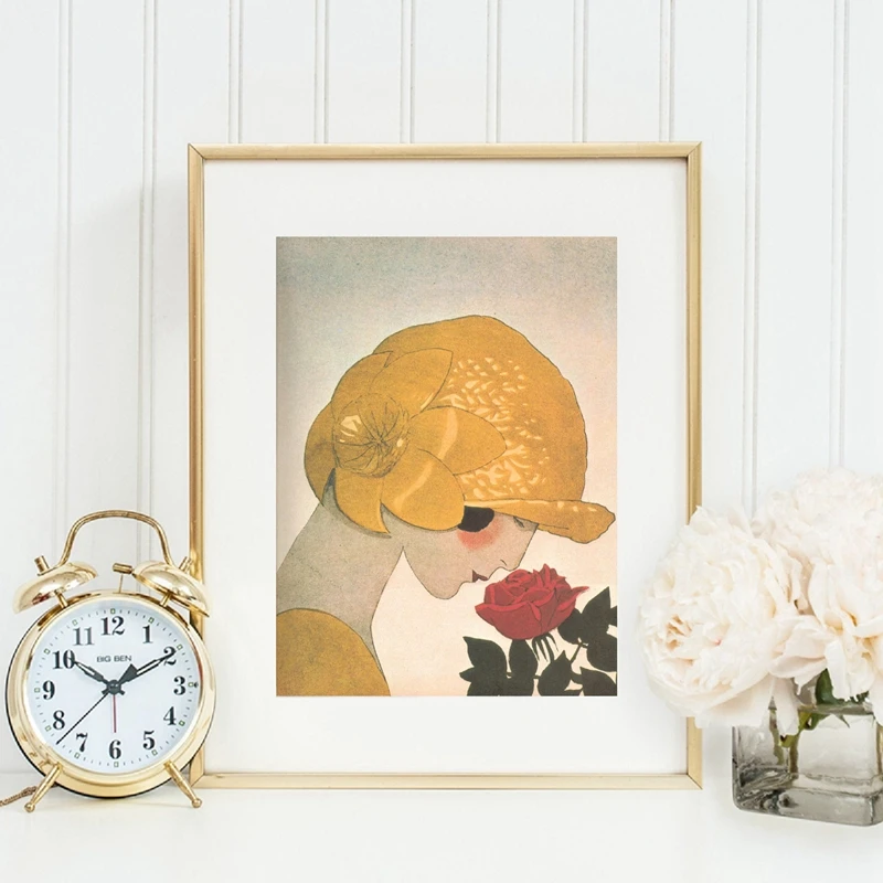 Винтажная иллюстрация, шляпа для девочки, роза, холст, картина на стену, модная Обложка, плакат на стену, цветочный принт, античный стиль, Декор