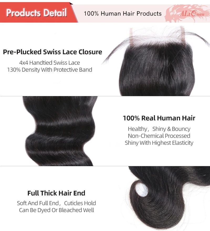 Наименование: бразильские волнистые пряди человеческих волос с застежкойНазвание бренда: Ali Queen Hair Products Co., LtdЦвет волос: натуральный черный цвет, можно окрашивать и осветлять.Фактура застежки: швейцарское кружево/HD кружево/прозрачное кружевоРазмер застежки: 4x4 / 13x4 с плотностью 130%Длина волос: 10 "~ 26"Материал волос: 100% натуральные волосы высокого качества