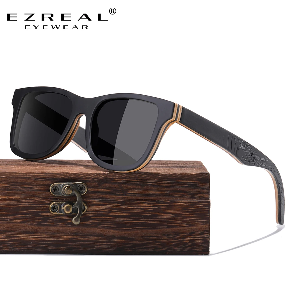 Солнечные очки EZREAL с деревянными дужками для мужчин и женщин, поляризационные солнцезащитные аксессуары ручной работы, для скейтборда, черные, S5832