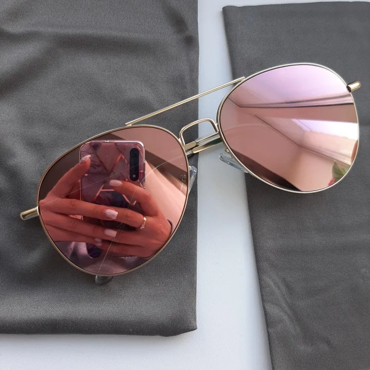 Доставка 2.5 недели. Я заказала розовые. Очки были аккуратно упакованы. Пришли в коробке, в комплекте мягкий чехол и защитная салфетка. Оправа металлическая. Стекла зеркальные снаружи. Они затемненные, вполне хорошо защищают от солнца. Качество отличное. Дефектов не было. Хорошее приобретение. Мне понравилась эта модель.