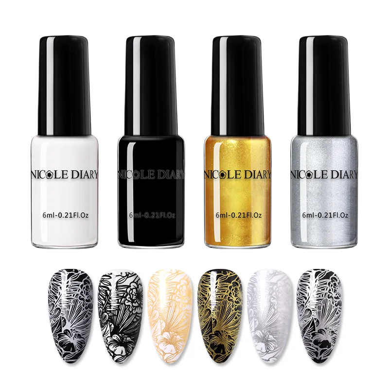 Лак для стемпинга NICOLE DIARY, золотой, серебряный, черный, белый, для ногтевого дизайна