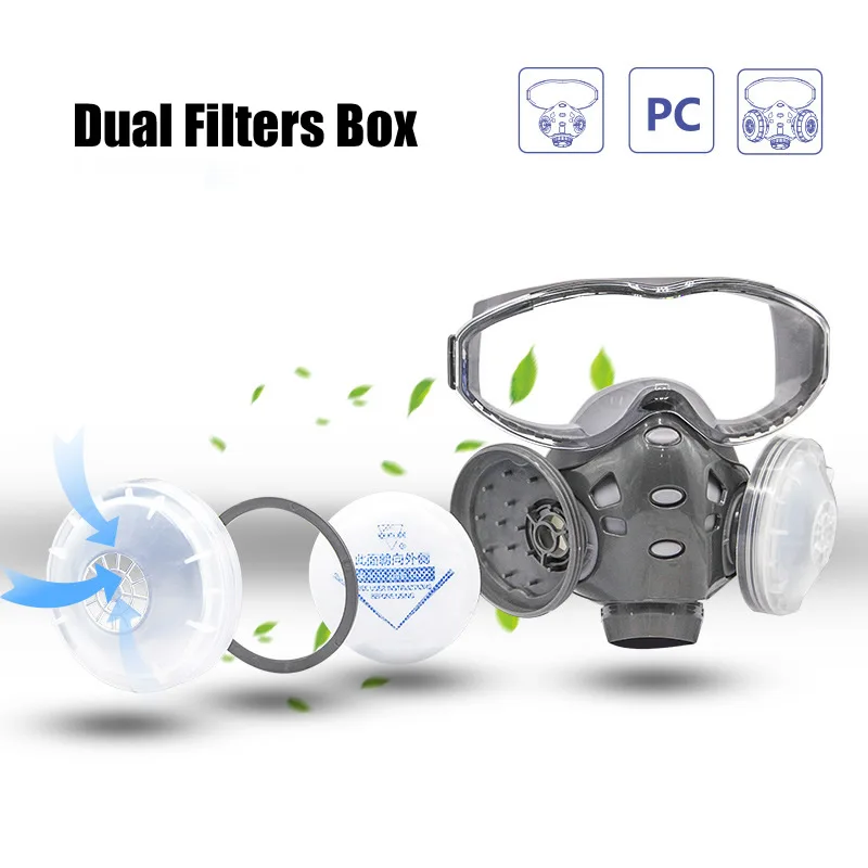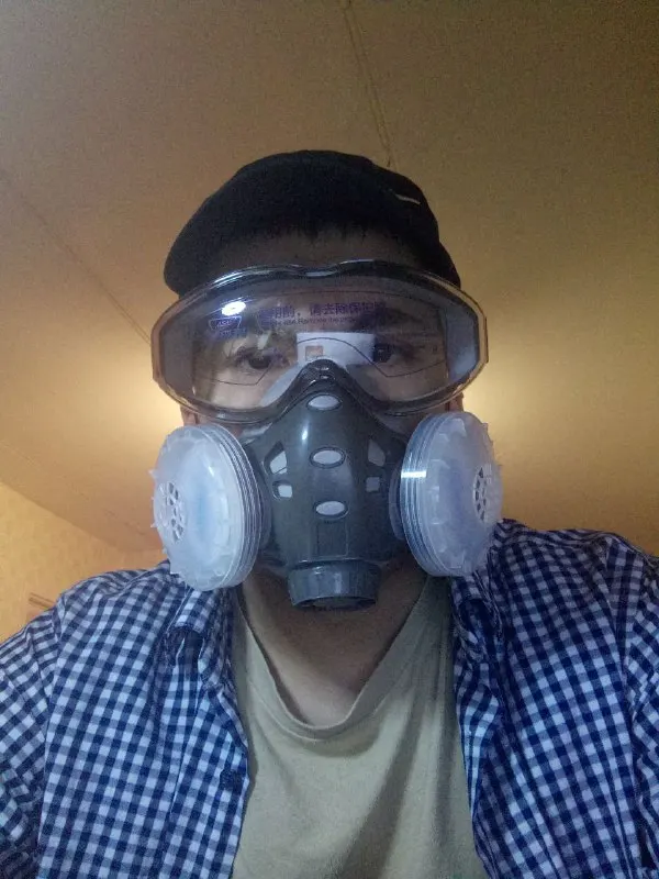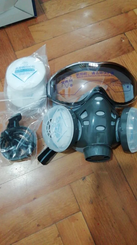 хороший респиратор, хорошо сидит на не крупном лице. Дышится легко. Фильтры правильной круглой формы, при необходимости можно вырезать из фильтрующего элемента, например мешков для пылесоса. Очки обычные пластиковые, но с респиратором сочетаются идеально.