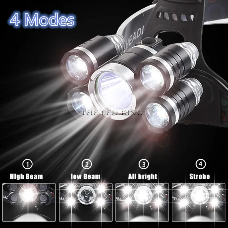 Налобный фонарь, с 5 мощными светодиодными лампами и аккумулятором 18650