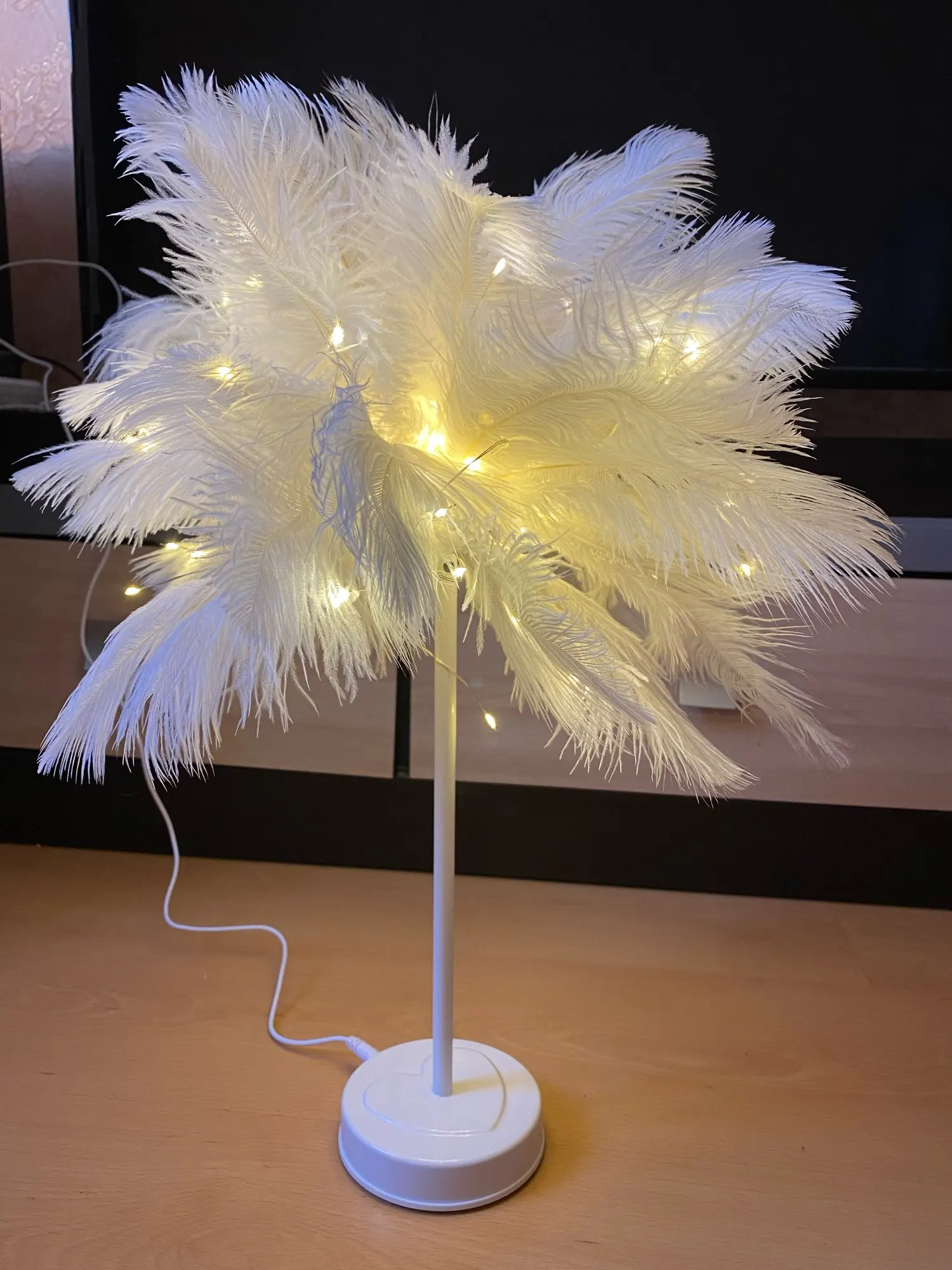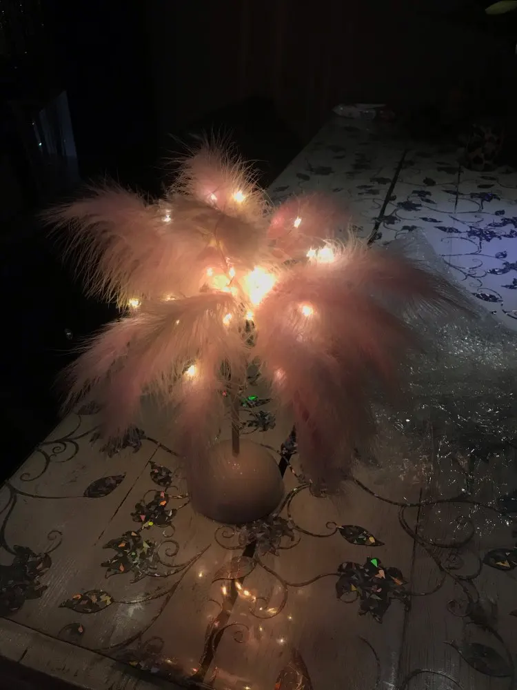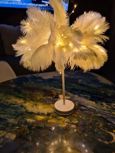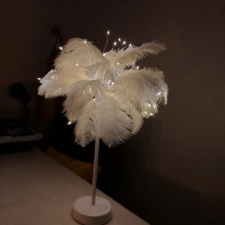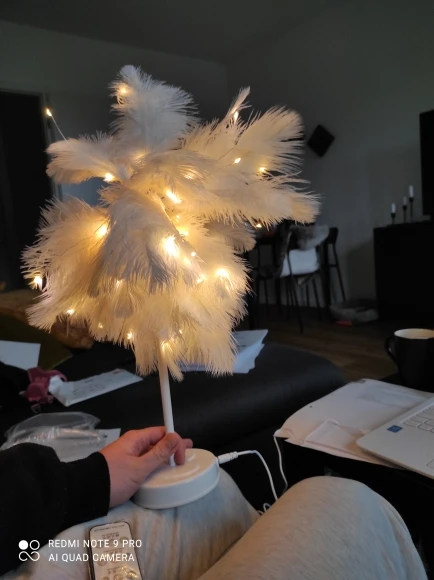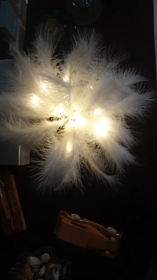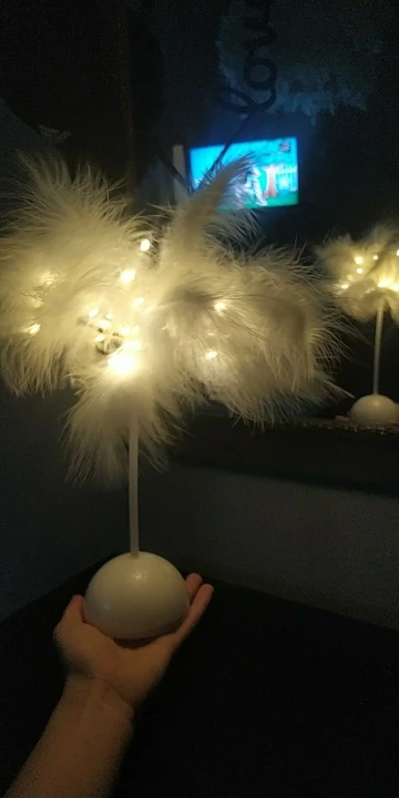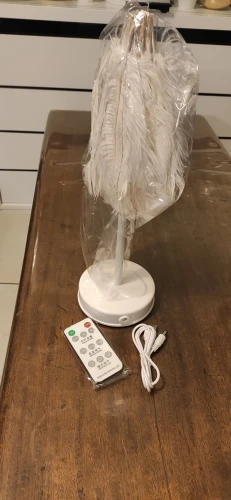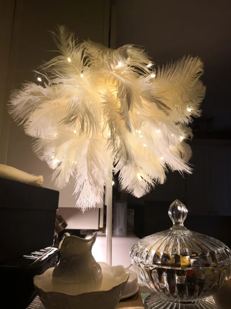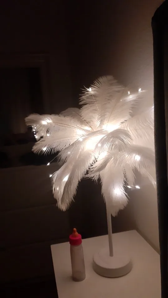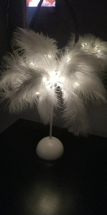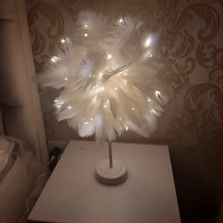 Очень быстрая доставка. Продукт очень красивый, как показано. Хорошо работает и с батареей в лампе. Имеет только некоторый запах от сглаживания и хранения перьев, необходимо распылить легкий аромат для диффузного запаха, который исчезл через несколько дней.