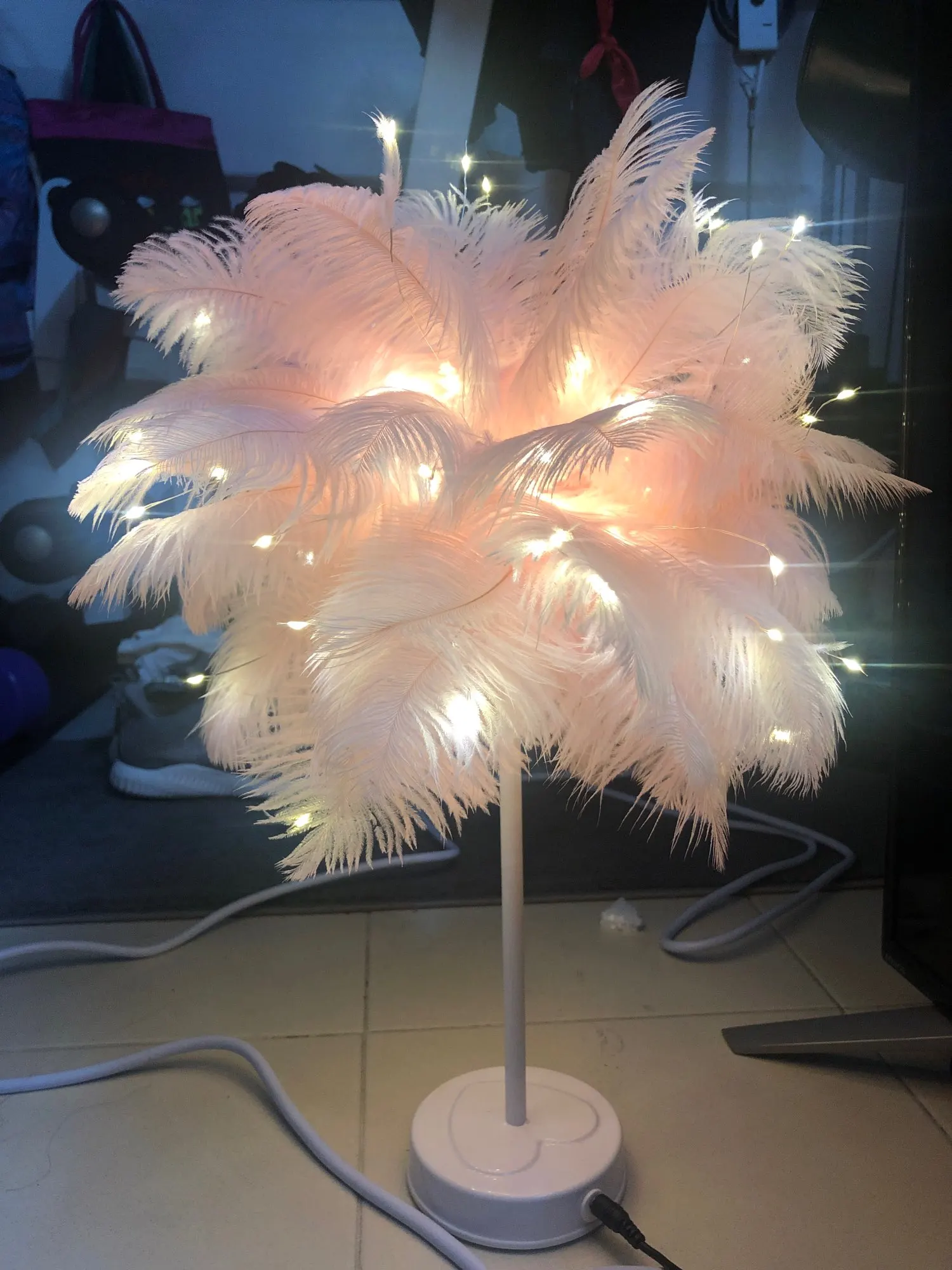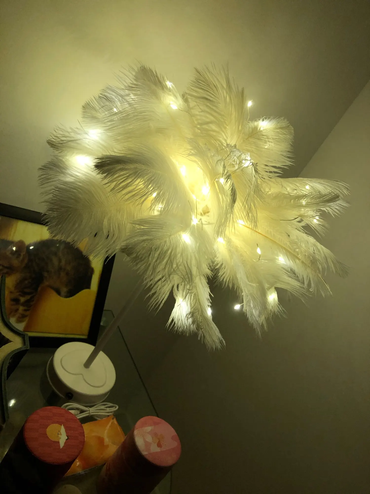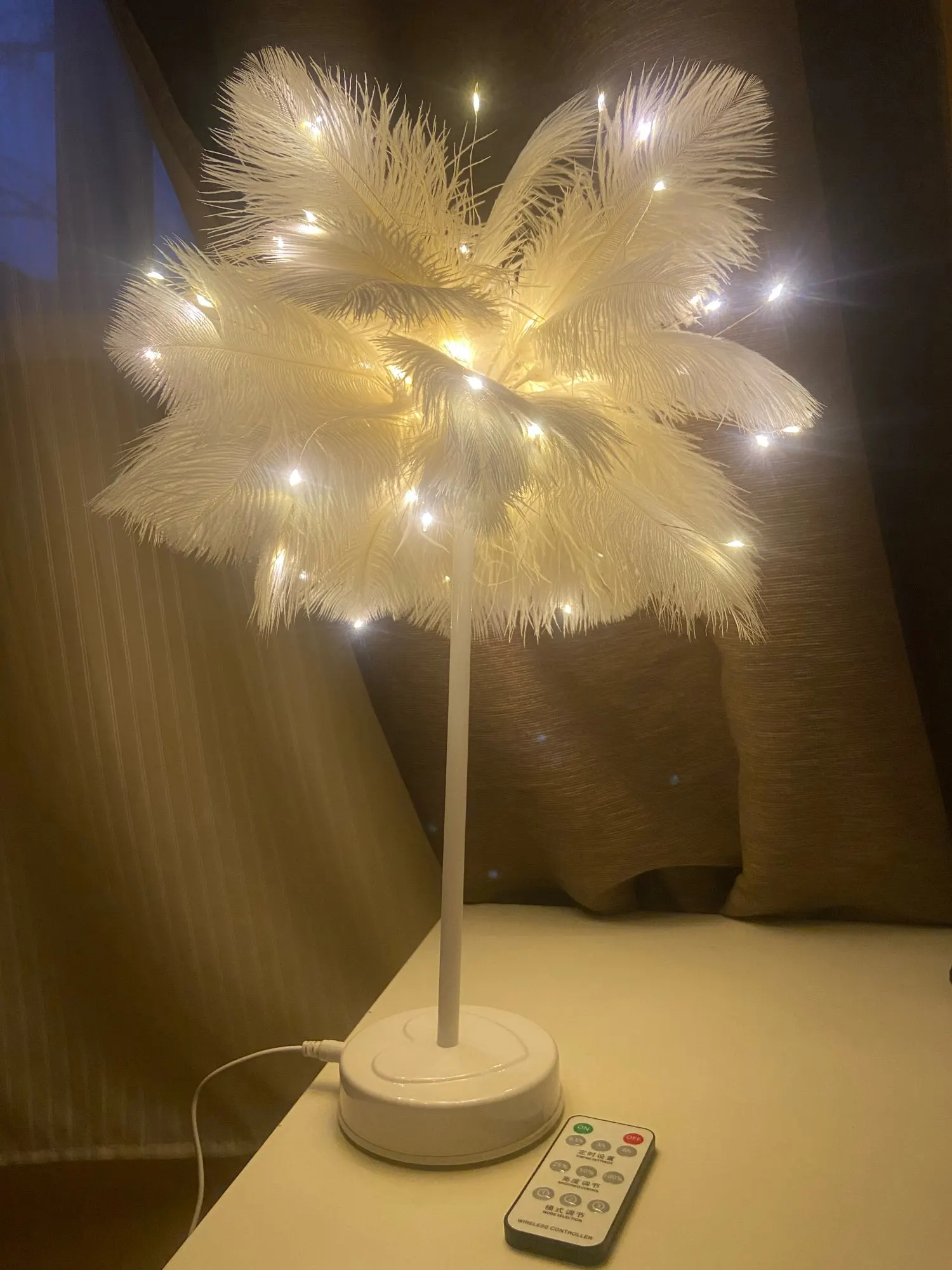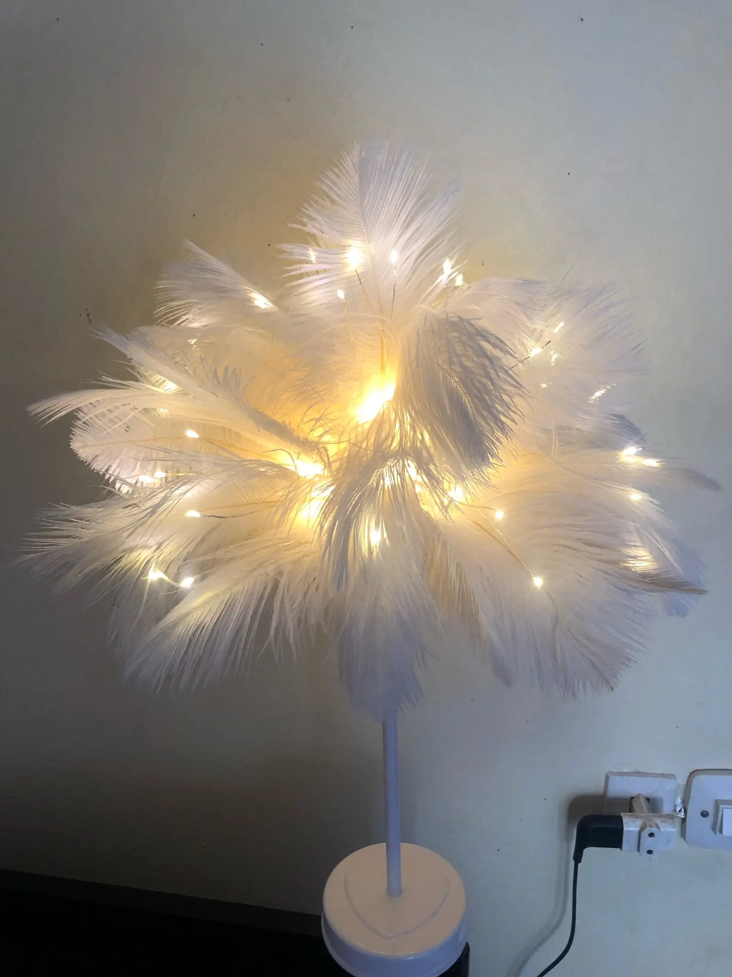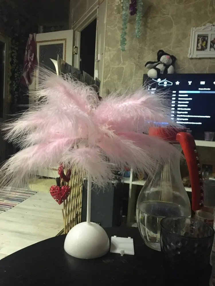 Очень быстрая доставка. Продукт очень красивый, как показано. Хорошо работает и с батареей в лампе. Имеет только некоторый запах от сглаживания и хранения перьев, необходимо распылить легкий аромат для диффузного запаха, который исчезл через несколько дней.