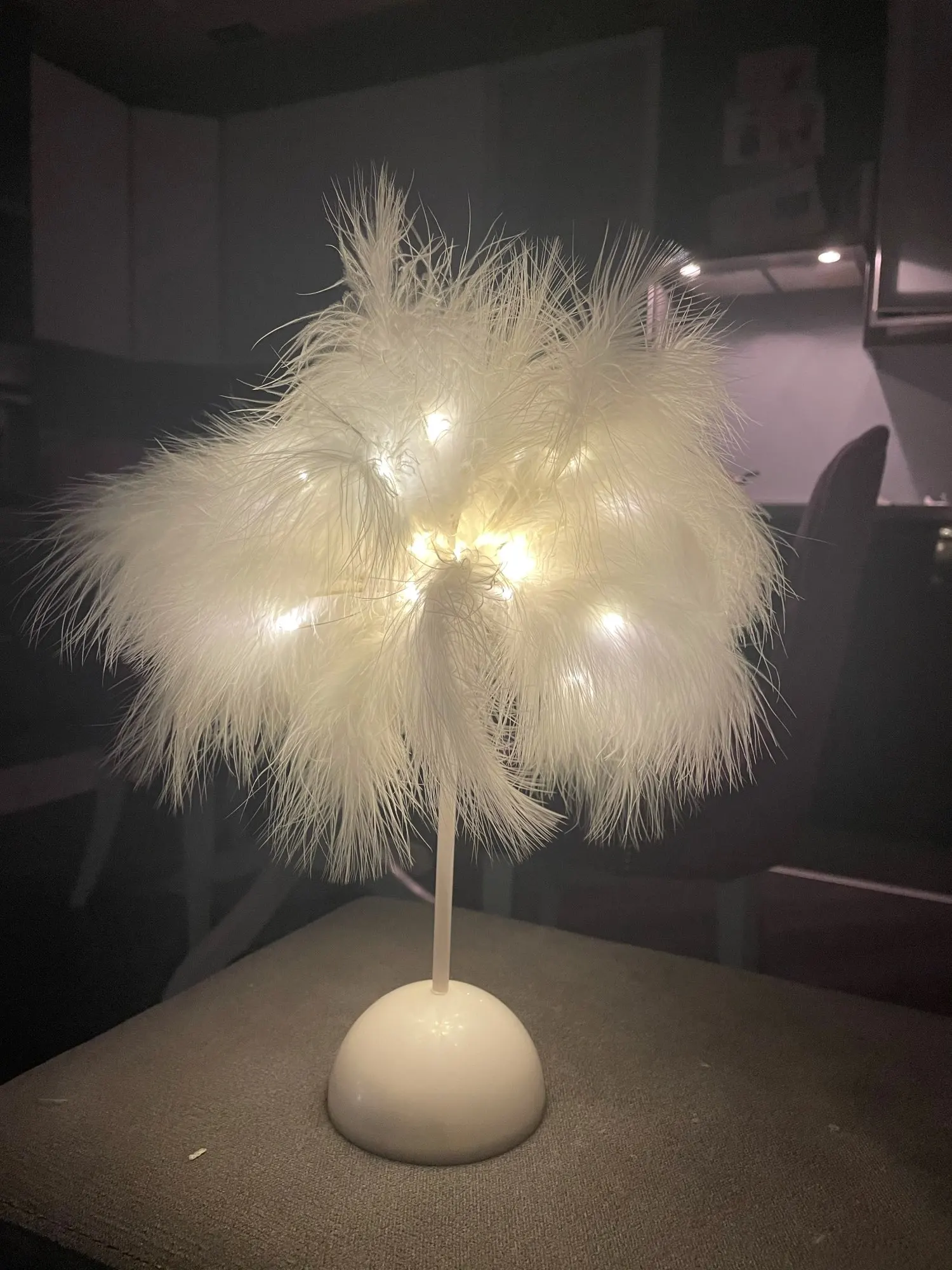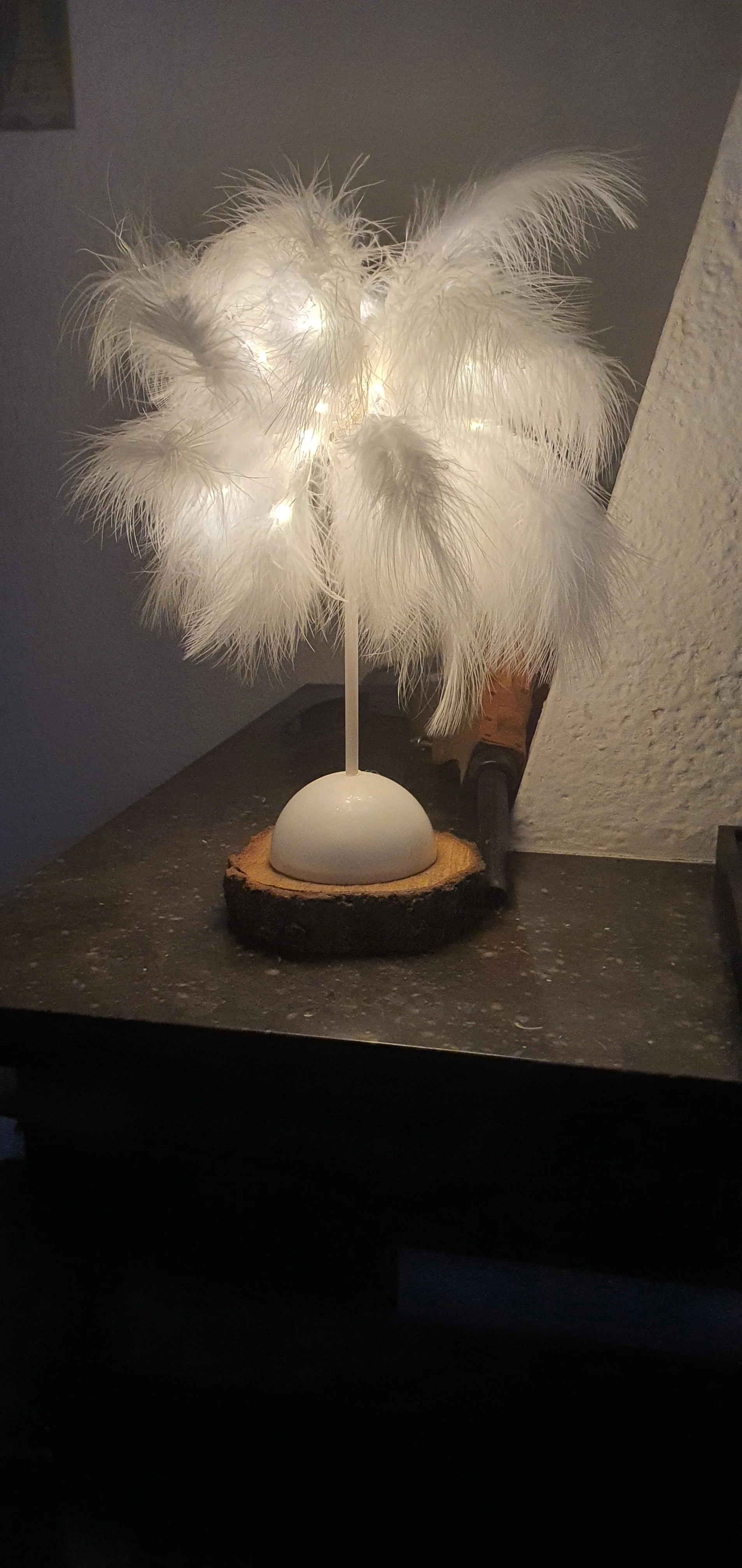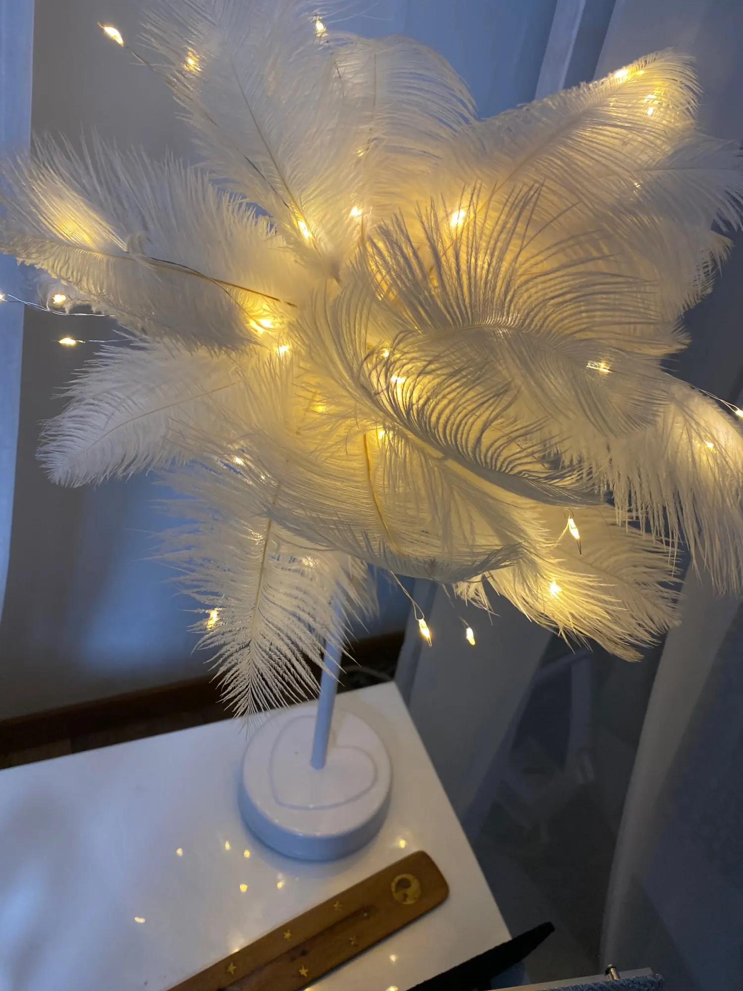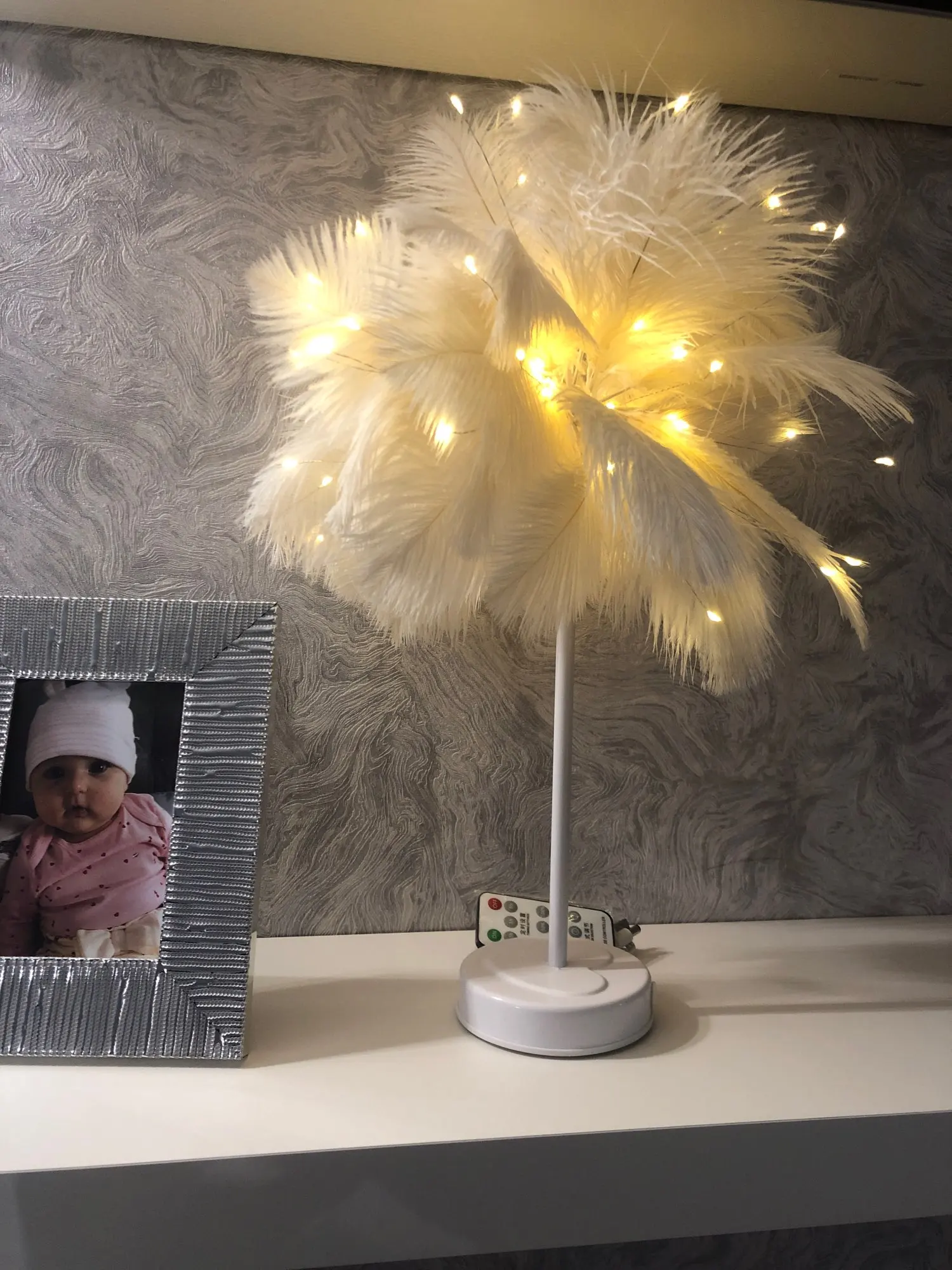 Очень быстрая доставка. Продукт очень красивый, как показано. Хорошо работает и с батареей в лампе. Имеет только некоторый запах от сглаживания и хранения перьев, необходимо распылить легкий аромат для диффузного запаха, который исчезл через несколько дней.