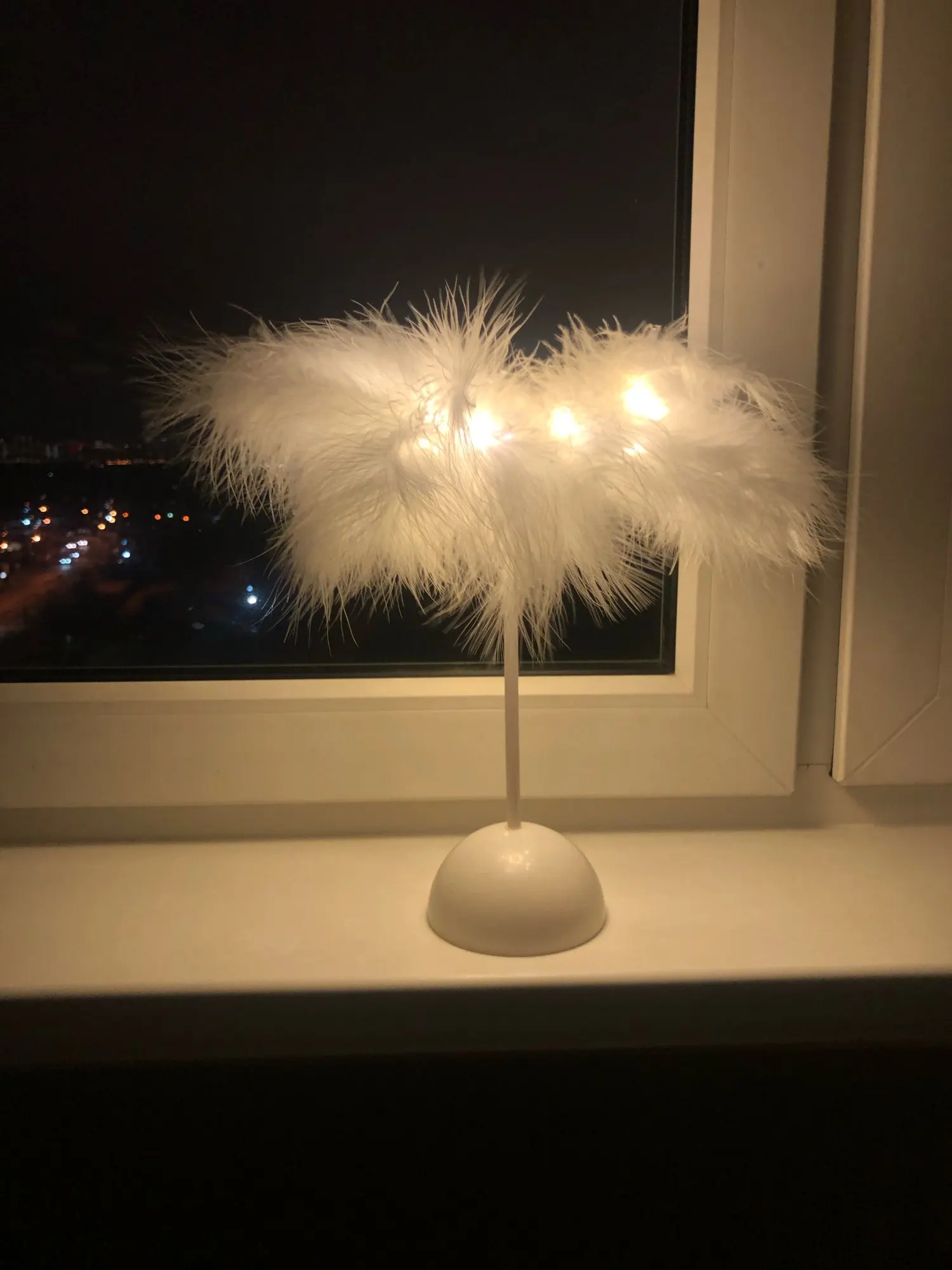 Мне не понравилась в жизни; видно, что подставка-дешевый пластик; в целом-прикольный ночник,перья распушились; но сразу выдаёт основание его реальную стоимость; больше похож на игрушечный или детский