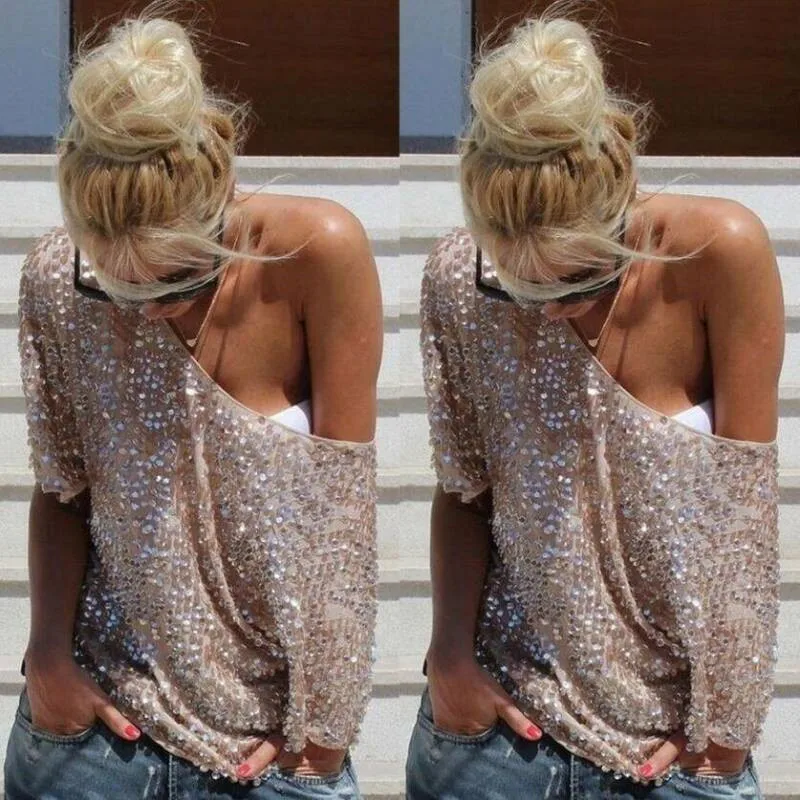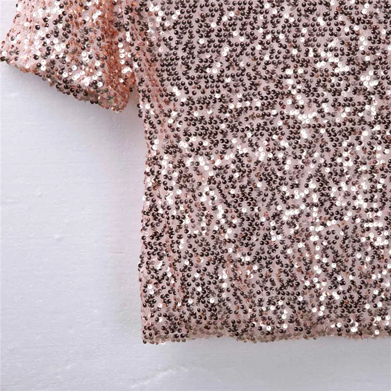 Элегантная Женская Блестящая облегающая футболка с блестками, женская летняя Модная стильная футболка золотого цвета с блестками для танцев, женские топы