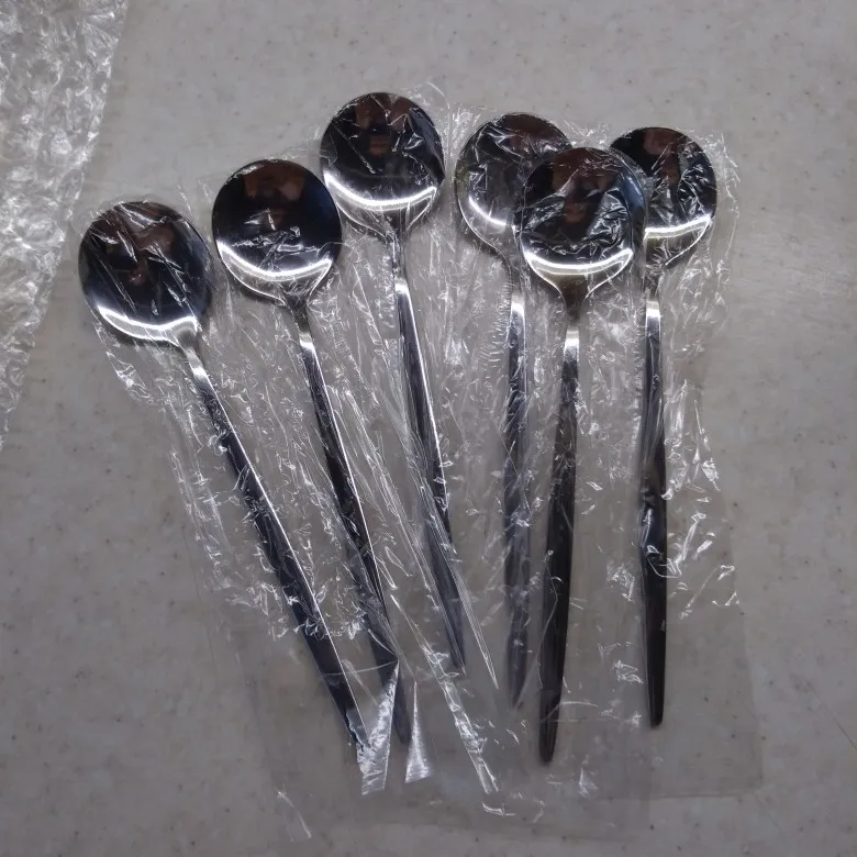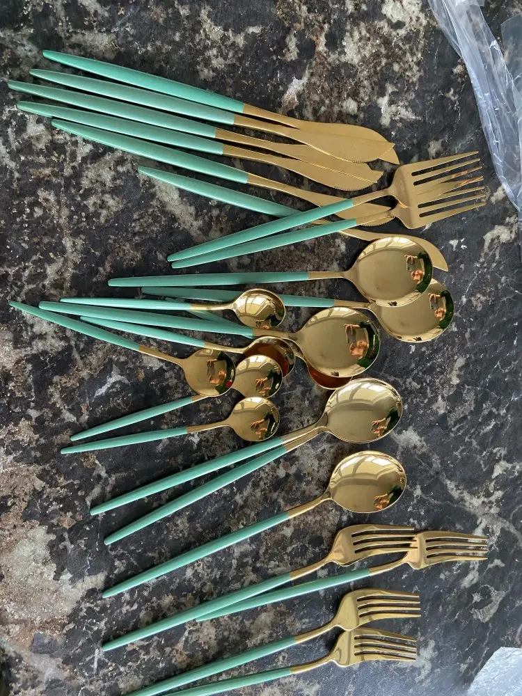 Товар пришёл прекрасно упакованный : каждый предмет в отдельный плотный пакет, все 6 предметов перевязаны резинкой и в пупырчатую плёнку и все это в плотную коробку. Ножи достаточно острые, вилки ровные, ранее покупала не у этого продавца сервиз , все было шикарно, но ложки острые, есть с них было опасно(у большинства) здесь такой проблемы нет, края ложек хорошо обработаны. Из минусов: ложки скорее по размеру не чайные, а кофейные (ну, может чуть больше кофейных); лезвие Ножей на картинке смотрится чуть более широким и длинным, в Реале очень похожи на ножи-скальпели; у меня айфон на моем телефоне цвет смотрится Как цвет «Тиффани» (светло-бирюзовый) , по факту это все таки зелёный , вложила фото. Но это прям немного отличие не критично, но я буду покупать позже новый, тк недовольна цветом, но это не вина продавца, это минимальное искажение цвета на фото ; просто инфо для покупателей.