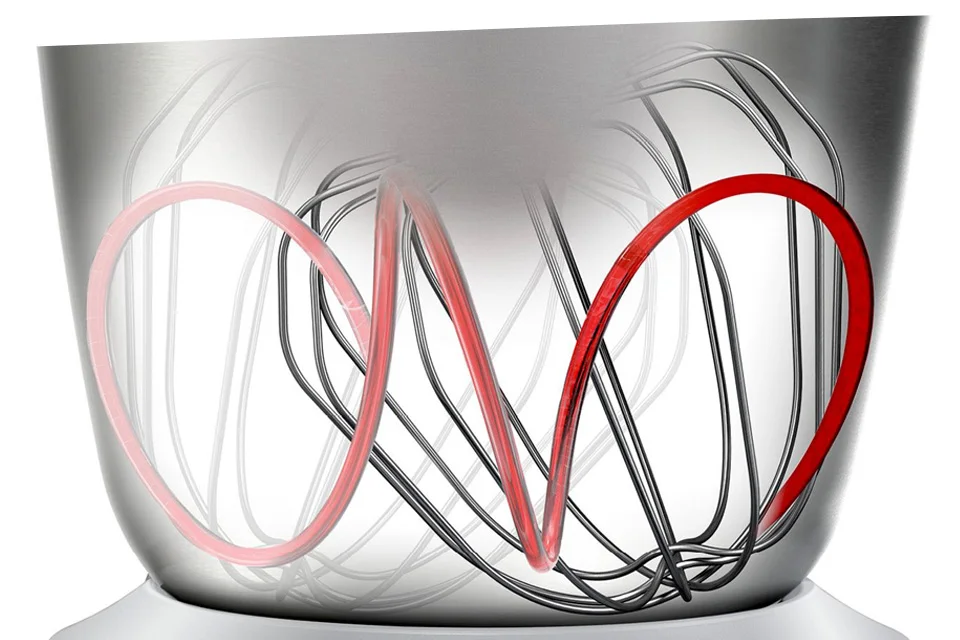 Для идеального результата все ингредиенты должны быть тщательно вымешаны. 3D планетарное вращение означает, что венчик вращается в трёх направлениях, тогда как основание движется в противоположном направлении. Благодаря этому, ингредиенты тщательно собираются со стенок и дна чаши и тесто становится более пышным.