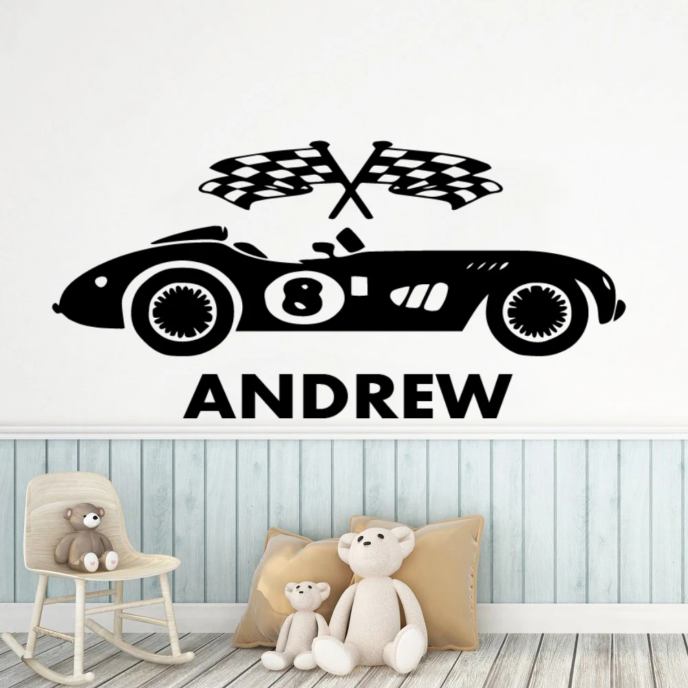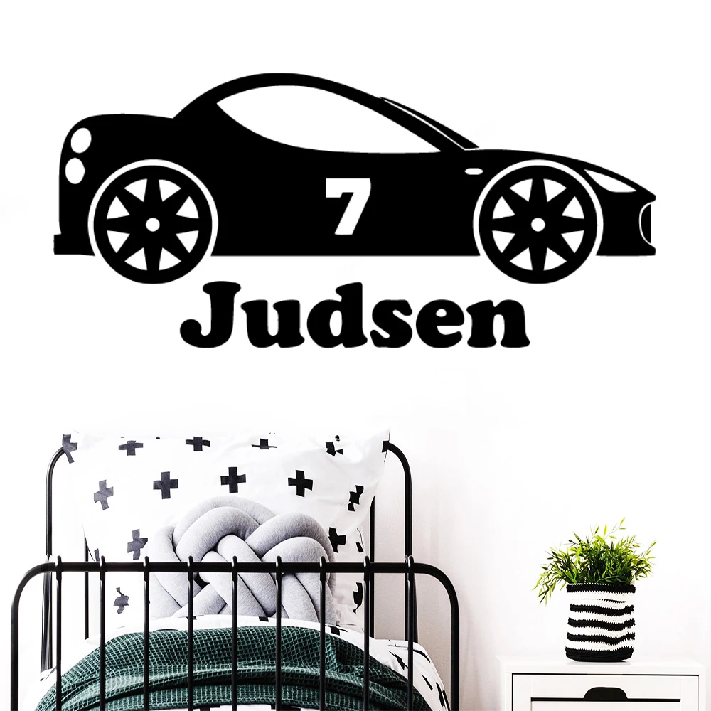 Горячая Распродажа, Виниловая наклейка на стену с именем для спортивного автомобиля на заказ для мальчика, детской комнаты, наклейка на стену, Виниловая наклейка для спальни