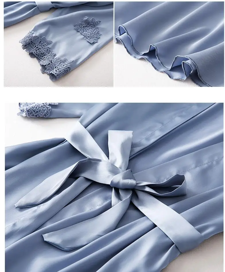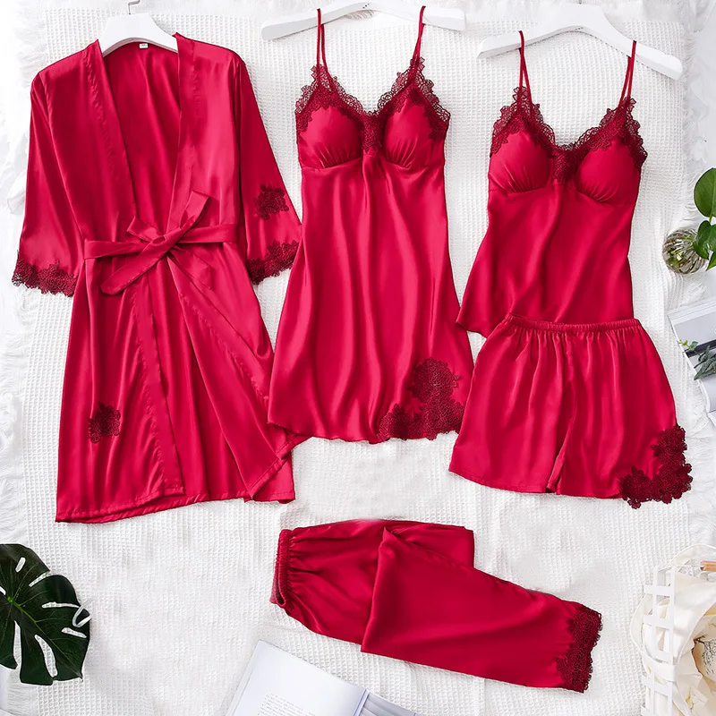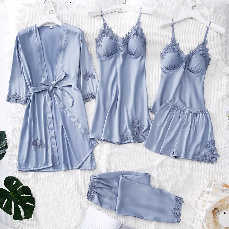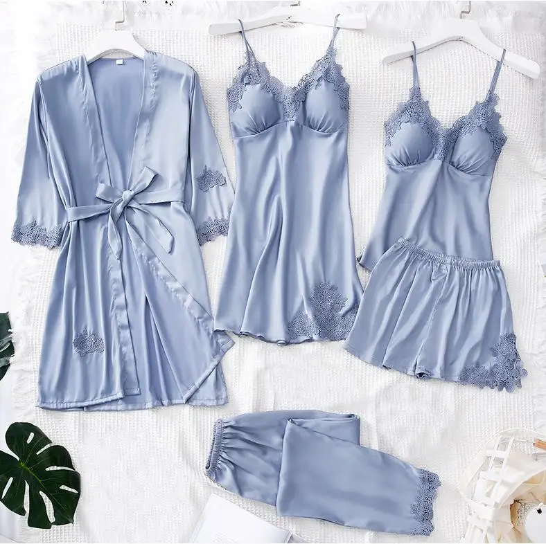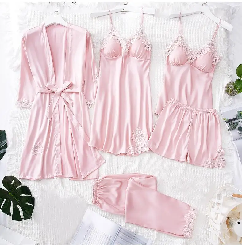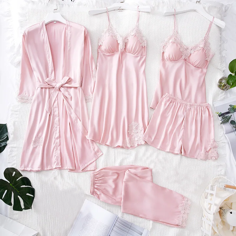 Женское кимоно, халат, бальное платье, 5 шт., костюм, ночная рубашка, комплект одежды для молодых девушек, атласная Сексуальная кружевная отделка, одежда для сна, повседневная домашняя одежда