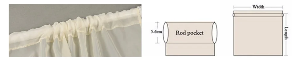 Карман пришит через верхнюю часть панели занавеса, через которую вставляется карниз. Карман штанги 5-8 см, который входит в длину занавеса.