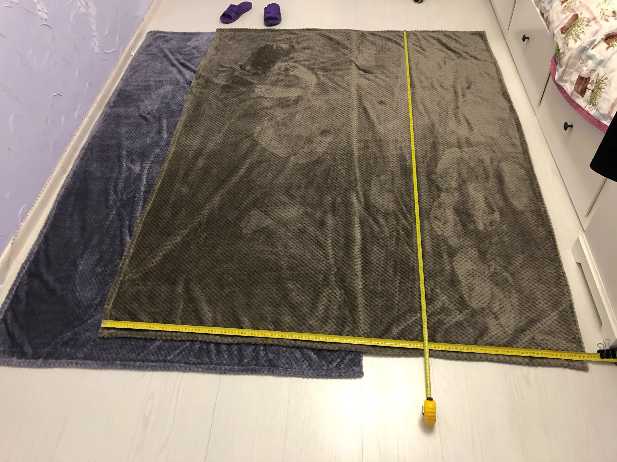 Заказывала 2 покрывала и 2 маленьких что бы сшить из них диванные подушки. Сиреневое в принципе норм, по длине совпадает, по ширине нету 5 см, но это не критично. Зато коричневое вообще не совпало на 10см!!!! И в ширину нет 7см!!! В итоге кровать не закрывается полностью!!! Видно на фото. Открыла спор на 500р, деньги вернули сразу. Теперь надо докупать маленькое покрывало и дошивать из него то что не хватает. Мне лишняя работа и потеря времени. В целом получается что это какая-то лотерея....