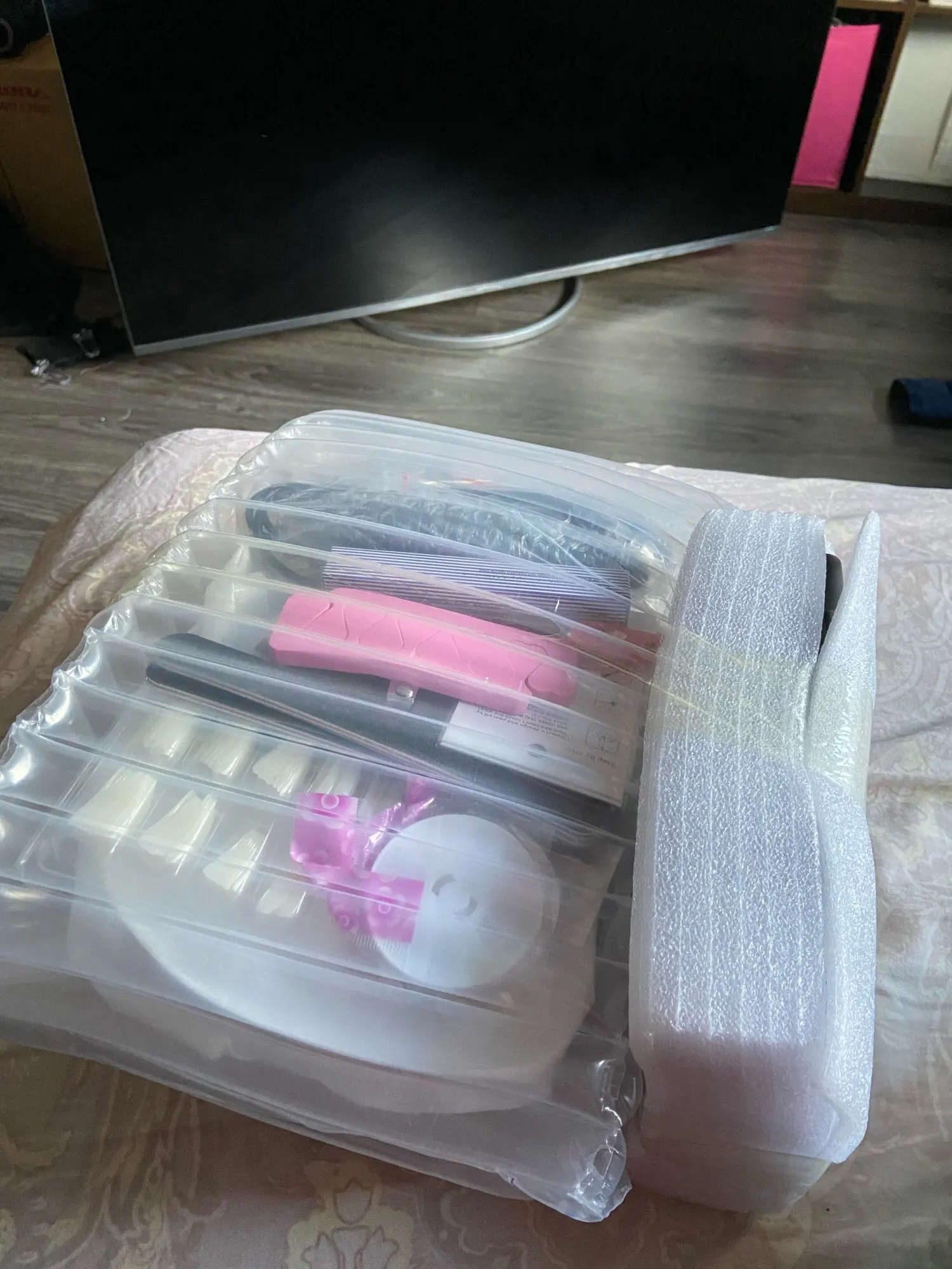 Заказывала самый апгрейдный наборчик для домашнего маникюра на 11.11,пришел быстро, через неделю забрала на почте. Упаковано хорошо, в коробке, лампа и аппарат в воздушных пакетах. Опробовала только сейчас, отчего и назрел отзыв. Аппарат для маникюра хорош, мощный и тихий, но фрезы идущие в комплекте просто мрак, лучше сразу заказать хорошие чем убиваться в этими. Лаки достались по цветам просто "вырви глаз", но и среди них есть нормальные, топ и база хорошие, топ без липкого слоя, что очень хорошо. В комплекте много вещиц для любителей, стразы, блески, накладные ногти и прочая мишура. Для экспериментов над собой самое то.
