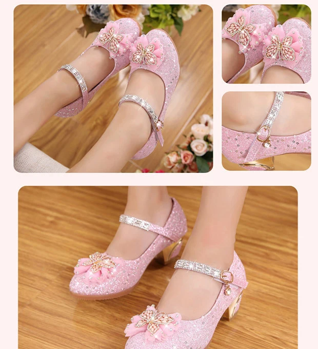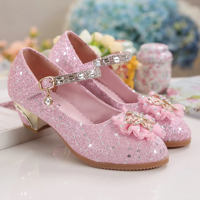 Туфли для девочек, новинка, высококачественные милые детские вечерние туфли на высоком каблуке для девочек, кожаные туфли принцессы с блестками и стразами
