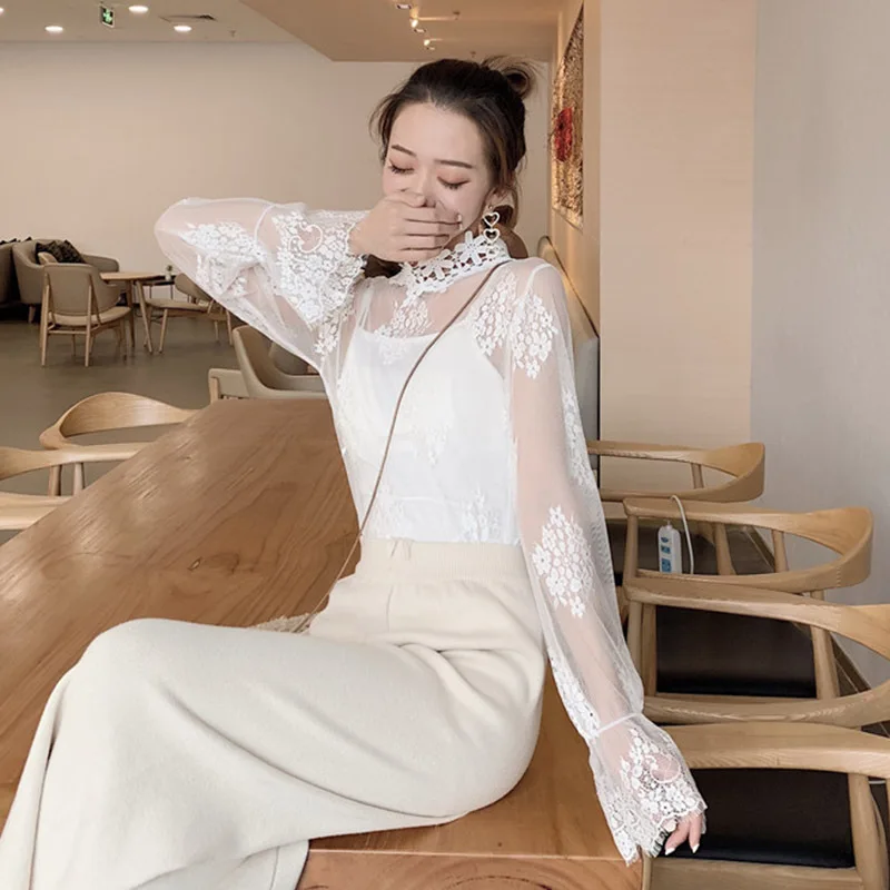 Женская кружевная блузка, с цветочным принтом, прозрачная, с длинным рукавом