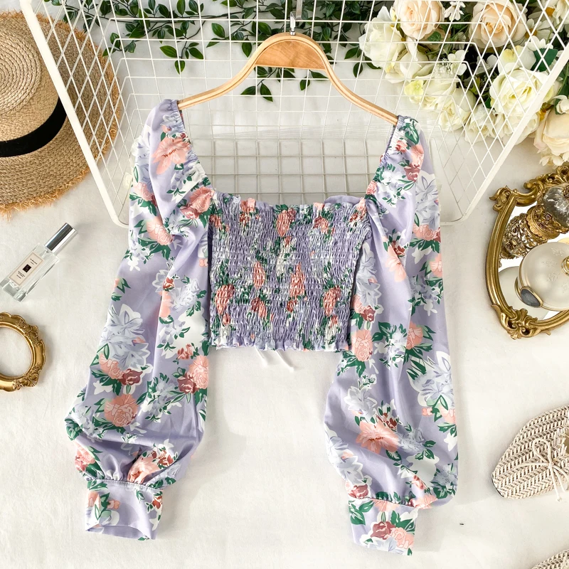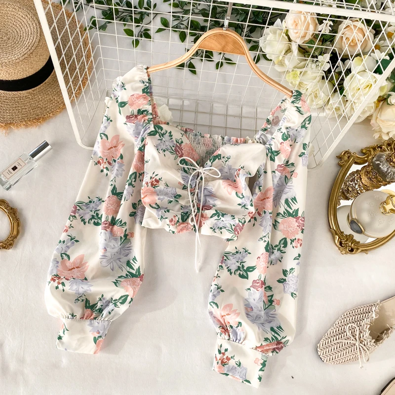 В ретро-стиле с квадратным вырезом эластичные тонкие с воздушными рукавами Топ супер фея с очаровательным цветочным принтом на шнуровке праздничное пляжное женская одежда