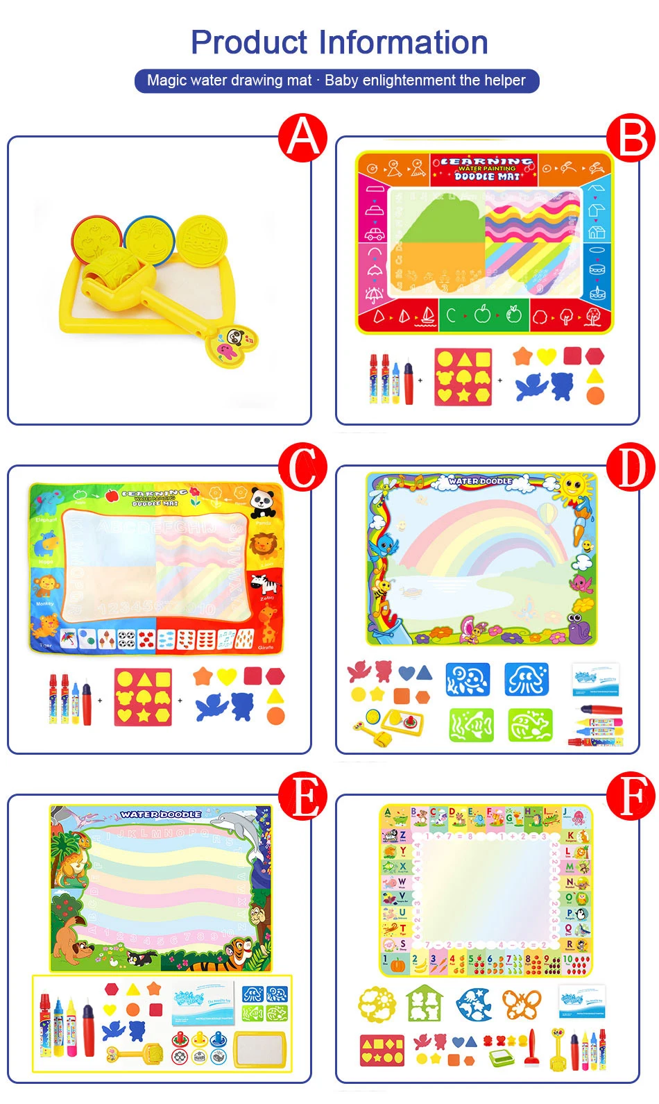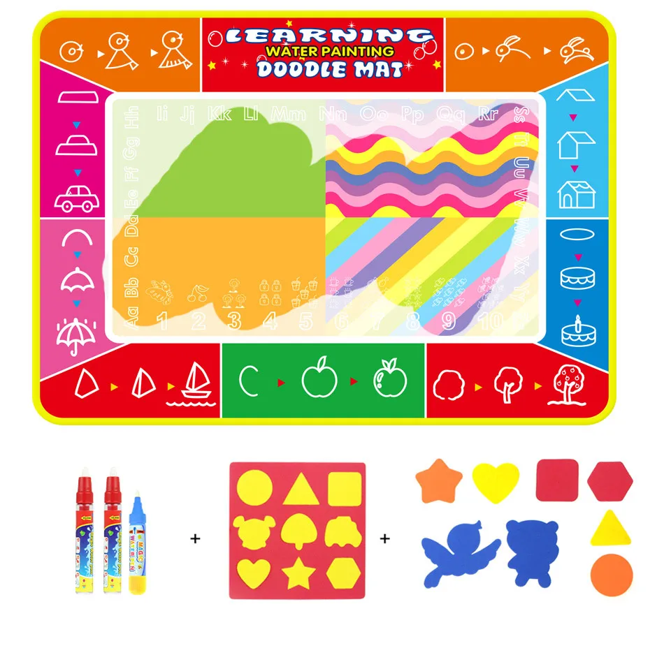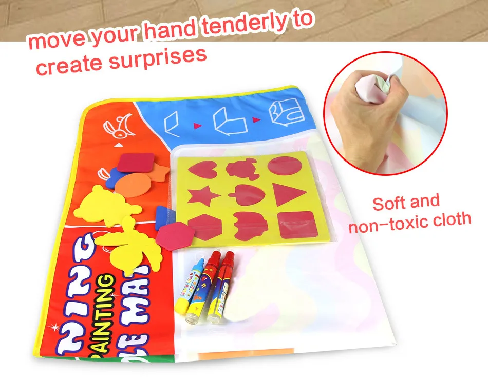Полиэстеровый материал, экологически чистый и нетоксичный, хорошая альтернатива для бумажного холста.Краситель кисти-это вода, которая является чистой и удобной, чтобы получить и безопасно для ребенка.Это может предотвратить вас от беспокойства о том, что ребенок окрашивает себя и окрашивает дом.Фантастический коврик для водного каракуля можно нарисовать и написать, чтобы полностью реализовать воображение ребенка. Настоящая игра для родителей и детей, усиливающая эмоциональную связь между родителями и детьми.