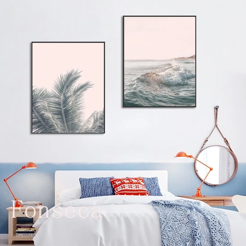 Современный тропический плакат растений Настенный декор искусство розовый лист пальмы холст живопись Ocea...