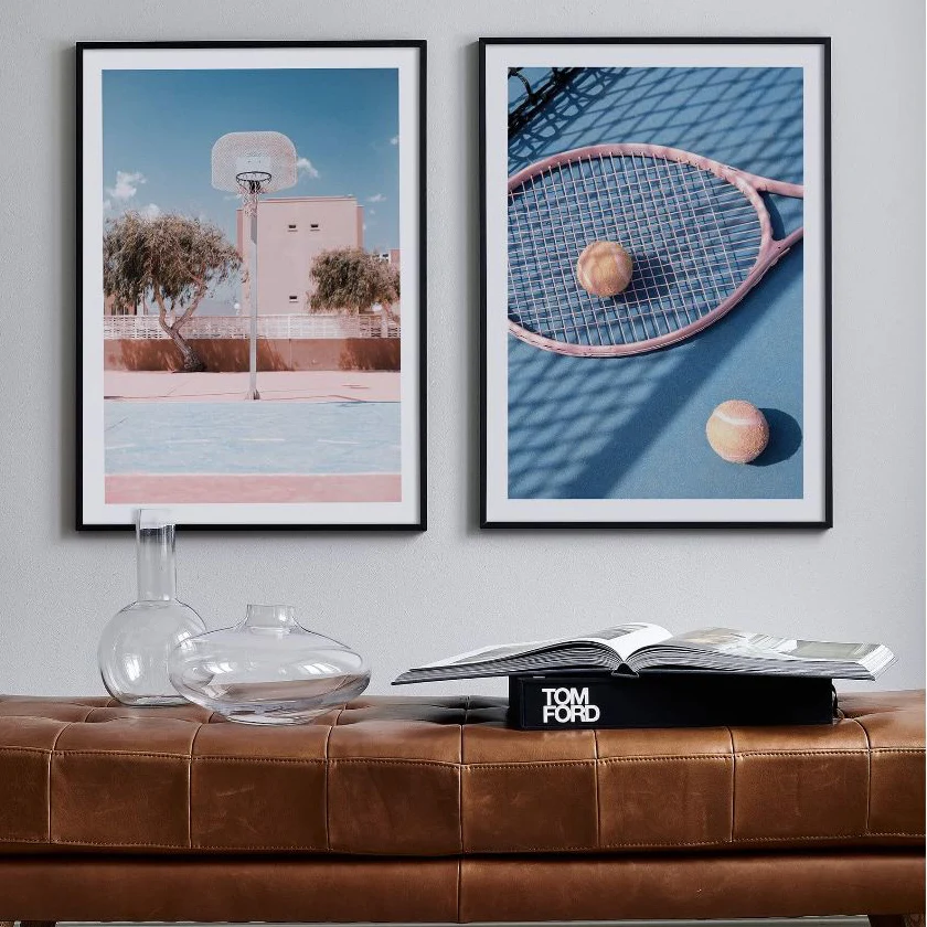 Голубые сиденья, розовые теннисные принты и постер, теннисный корт, баскетбольный холст, живопись...