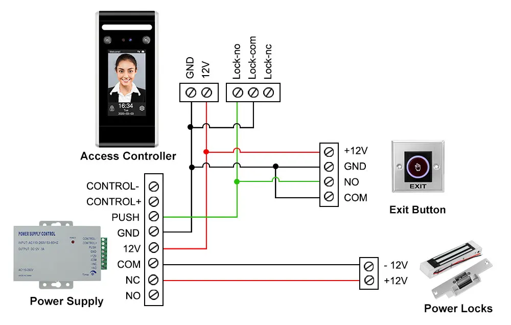 2. Если вы хотите использовать его в качестве клавиатуры контроля доступа по отпечаткам пальцев, то необходимо работать с источником питания DC12V, электрическим замком,Кнопка выхода.(Примечание: Оба источника питания, замки, кнопка выхода не включены в посылка, нужно купить дополнительно)