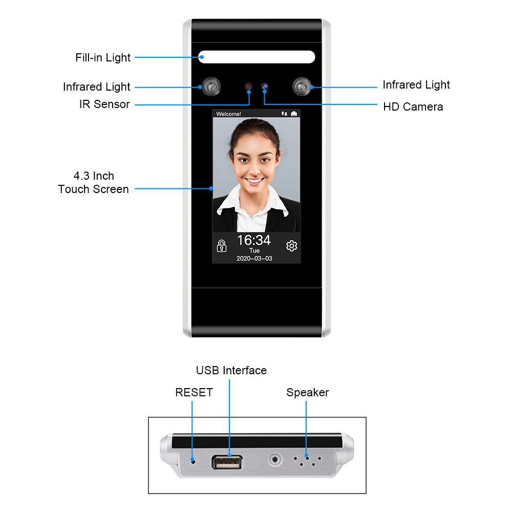 4,3 дюймов Wi-FiTCPIPUSB Инфракрасной сенсорной панели распознавание доступа Управление динамический с функцией распознавания лиц Биометрия пароль распознавание-DT60