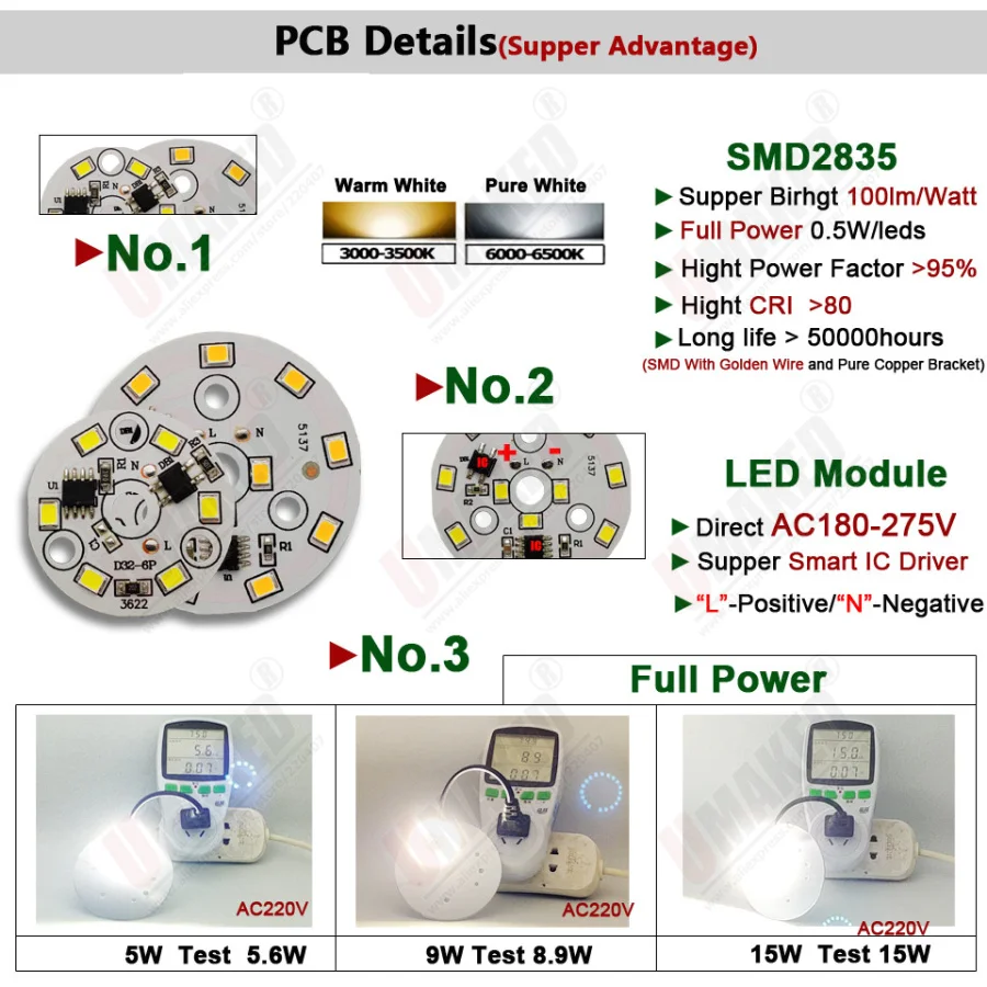 ОписаниеНаименование товара: ac220в светодиодный светильникМощность: 3 Вт 5 Вт 7 Вт 9 Вт 12 Вт 15 Вт 18 ВтНапряжение: AC180-265VРазмер: 32 мм/44 мм/50 мм/60 мм/74 мм/105 мм/120 ммСветодиодный чип: SMD2835Световой поток: 90 лм на мощностьCIR: Ra> 0,7Коэффициент мощности:> 0,85Материал: основание алюминиевой пластиныЦветовая гамма:Теплый белый: 3000-3500KЧистый белый: 6000-6500KГарантия: 2 годаСертификат: CCC CE и rohПрименениеШироко используется в лампы светильник ing, вниз светильник, потолочный светильник, крытый светильник ing, специальный светильник ing, обеденный светильник ing и так далее.Упаковка включает в себя10x1 шт. ac220в светодиодный светильник