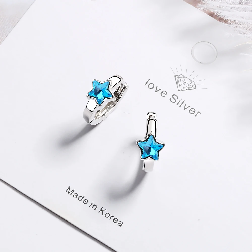 Cute Blue Crystal Stars 925 Sterling Silver Circles Small Loops Huggie Hoops Earrings For Women Jewelry Kids Girls Aros Aretes
