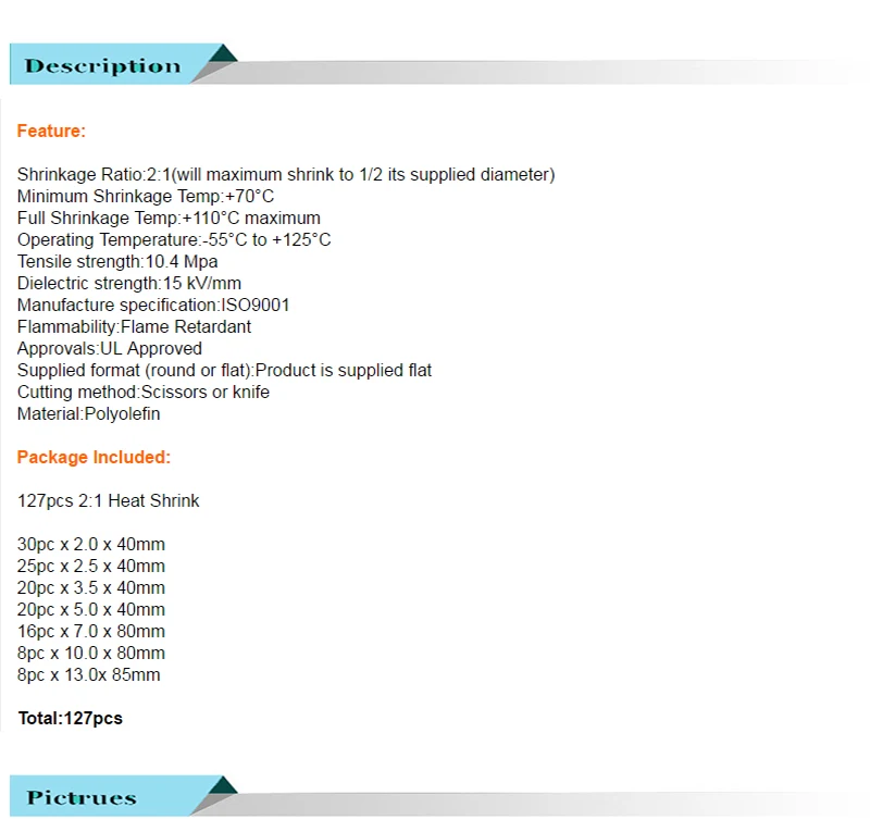 Описание:Большая коллекция термоусадочных труб, 8 спецификаций.Внутренний диаметр: 1,0 мм, 2,0 мм, 3,0 мм, 4,0 ММ, 6,0 мм, 8,0 мм, 10,0 мм, 13,0 мм минимум.Полностью сжатый Внутренний диаметр: 0,5 мм, 1,0 мм, 1,5 мм, 2,0 мм, 3,0 мм, 4,0 ММ, 5,0 мм, 6,5mm максимальный.Тип: термоусадочная трубкаЦвет: черныйОбщая длина: 7,28 м/286,61 "(прибл.)Общее количество: 150 шт.Коэффициент усадки: 2:1 (уменьшится до 1/2 его поставляемого диаметра)Материал: ПолиолефинМинимальная температура усадки: + 70 °CПолная Температура усадки: + 110 °C максимумРабочая температура: -55 °C - + 125 °CПрочность на растяжение: 10,4 МПаДиэлектрическая прочность: 15 кВ/ммВоспламеняемость: огнестойкостьСпособ резки: ножницы или острый ножПримечания:Благодаря светильник и экрана Цвет Товара может быть s светильник ly отличается из-за характеристик монитора компьютера.Возможны незначительные отклонения в размерах из-за различных измерений вручную.