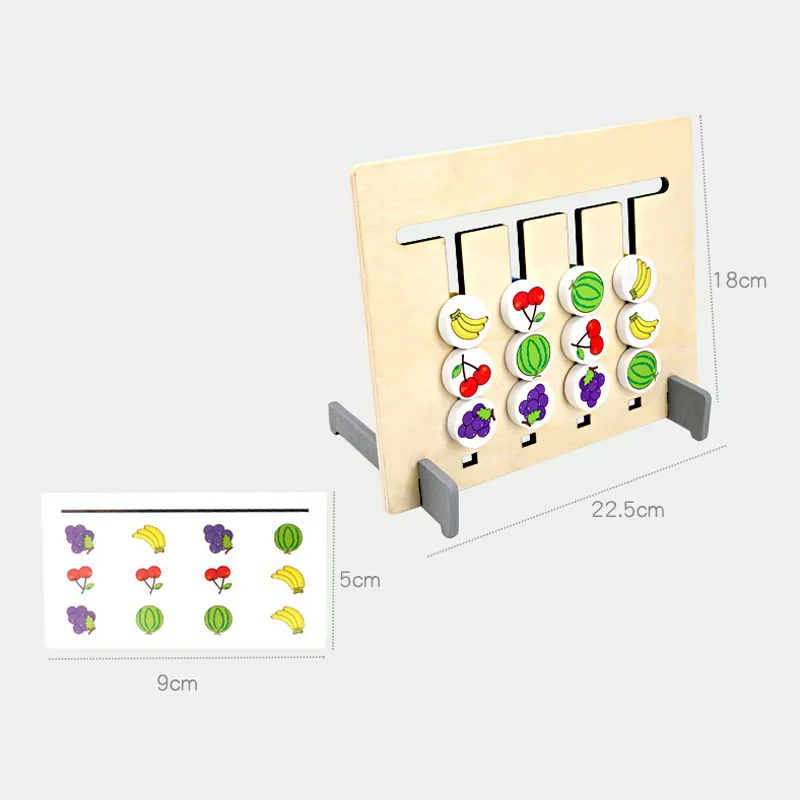 Двухсторонняя деревянная доска для пазлов: подходящая по цвету сторона-есть 4 ярких цвета-синий, желтый, зеленый, красный цвет. Форма Соответствует, есть 4 различных фрукта: виноград, банан, вишня и арбуз. Это помогает малышу распознавать фрукты. Хорошие игрушки Монтессори для малышей.