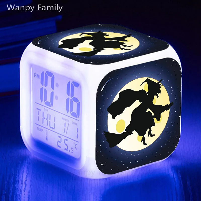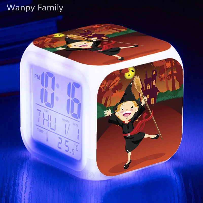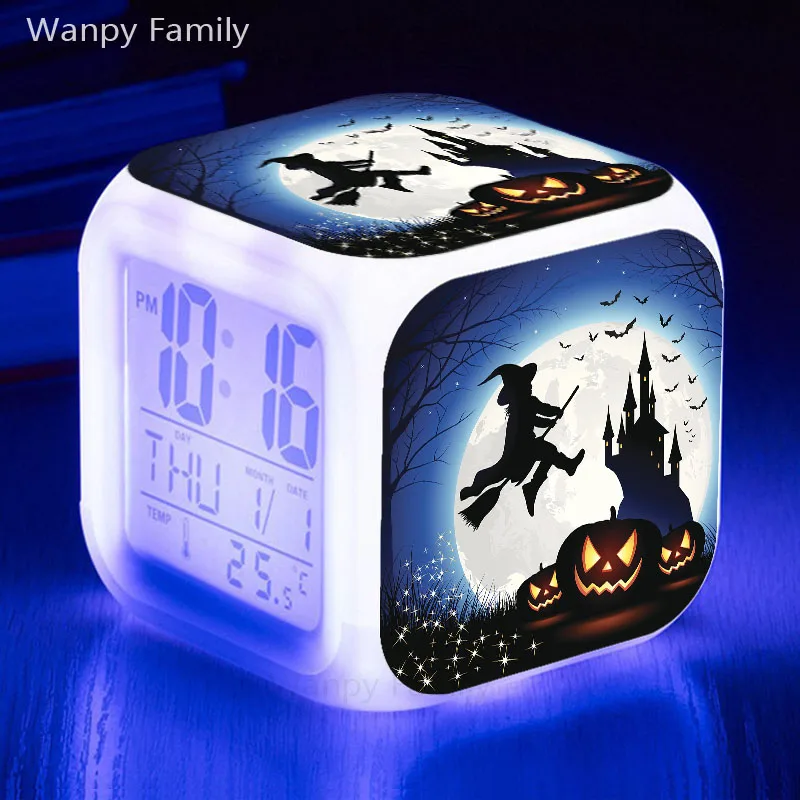 Хэллоуин светодиодный Будильник 7 цветов Изменение прикроватные настольные цифровые часы с термометром ночной Светильник вспышка электронные часы