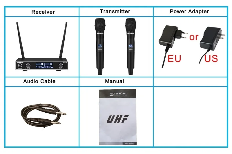 Капсула: Профессиональное аудио динамическое CapsulМощность передачи:<= 10dbmСтабилизация частоты: +-0.005%Батарея комплект из двух предметов, Батарея 1,5Материал:Пластиковый ручной, удобный и плавный опыт работы с элегантным внешним видом. Картридж:1) Тип: подвижная катушка2) Полярный узор: кардиоид