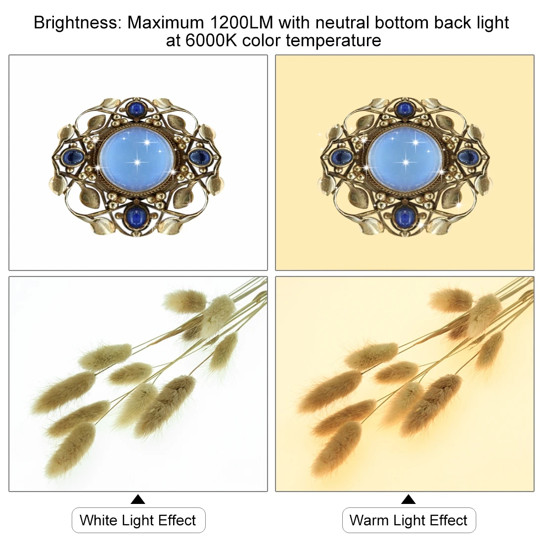 1. Эта бестеневая лампа ультратонкая и яркая, с идеальным и равномерным освещением, заточением контуров и краев продукта, значительно уменьшая последующее изменение фотографий 2. Подходит для ювелирных изделий, косметики, масштабных моделей, искусства, стеклянной посуды, электроники и модных аксессуаров. 3. Яркость: до 1200LM, нейтральная подсветка, цветовая температура 6000K 4. Переключатель управления регулируемой яркостью 5. Несколько штепсельных вилок на выбор (штепсельная Вилка стандарта США/штепсельная вилка стандарта ЕС/штепсельная вилка стандарта Великобритании/штепсельная вилка стандарта Австралии)