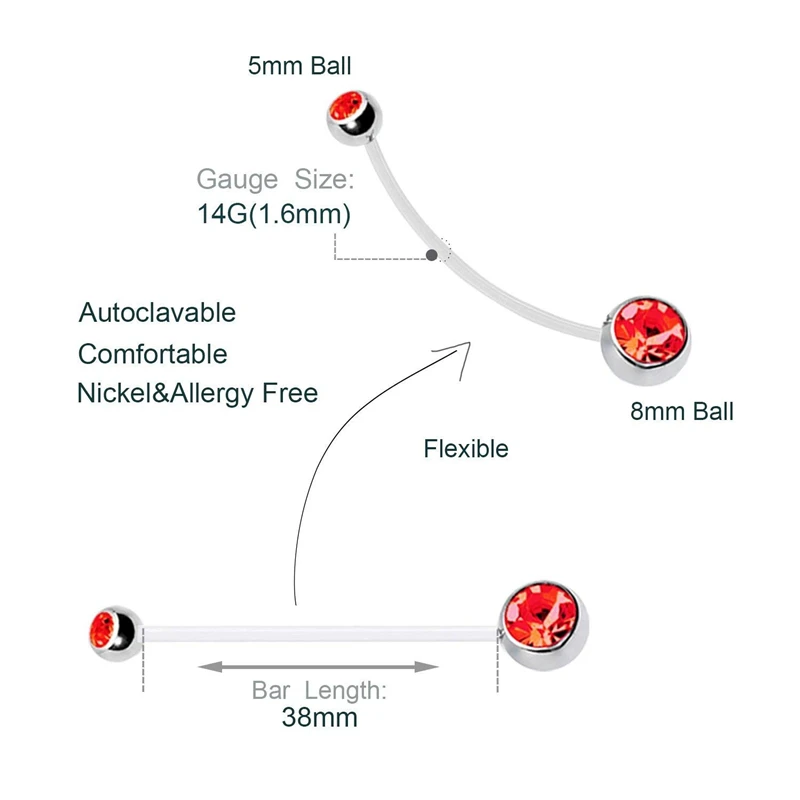 ● Стиль пирсинга: удобная гладкая поверхность, используется в качестве пирсинга для живота. Гибкая и мягкая планка, которую можно отрезать до любой длины. Если вам нужно изменить размер, Вырежьте под углом для достижения наилучших результатов