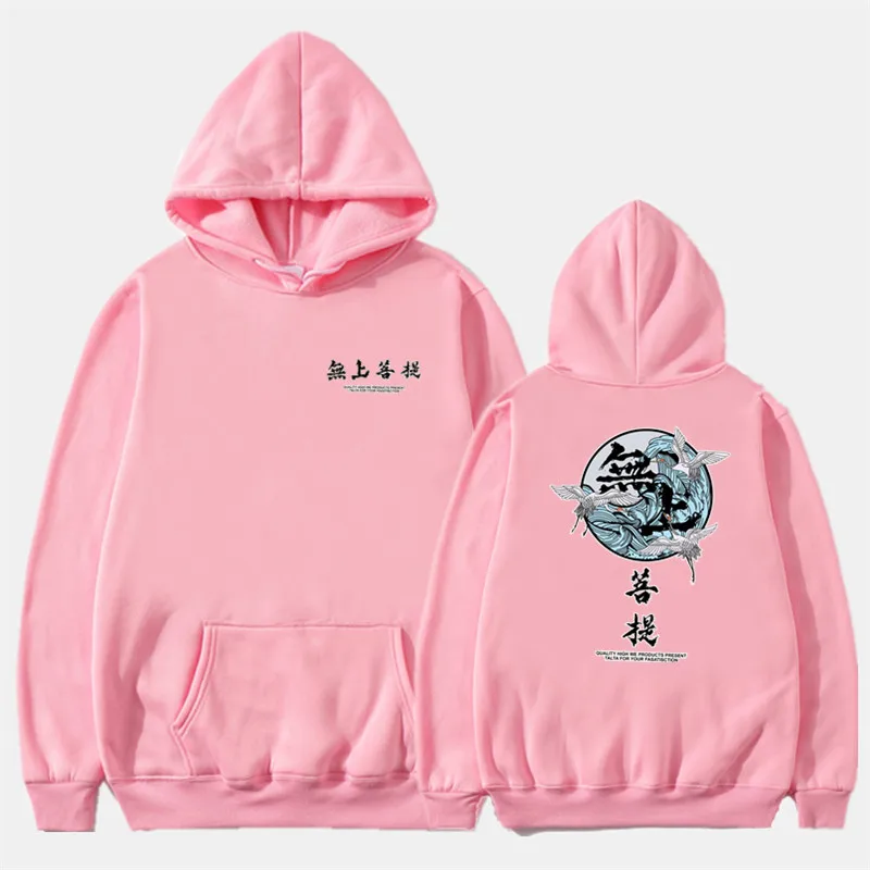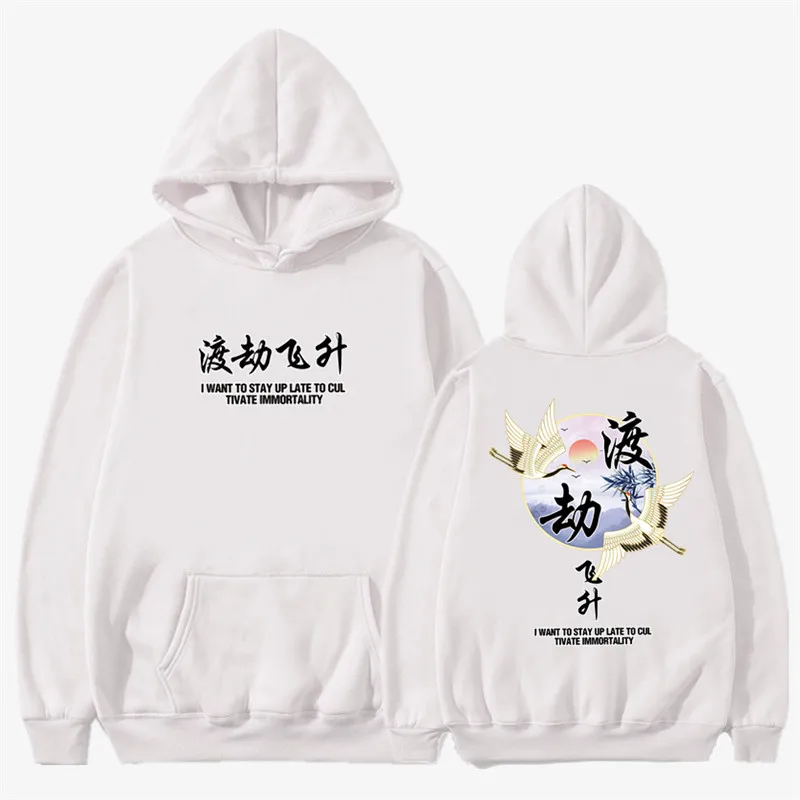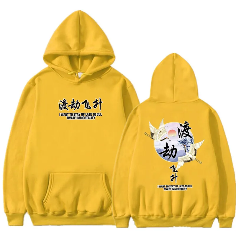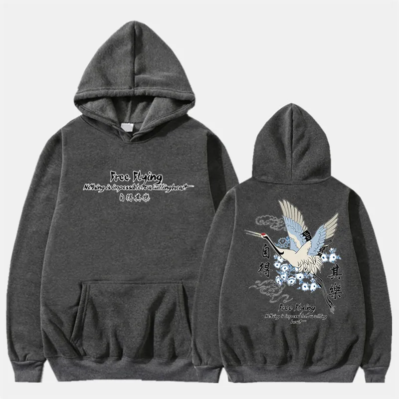 Толстовка с капюшоном для мужчин и женщин, уличная одежда с японским принтом, смешная бархатная толстовка с журавлем, повседневный черный Свитшот унисекс, Осень-зима