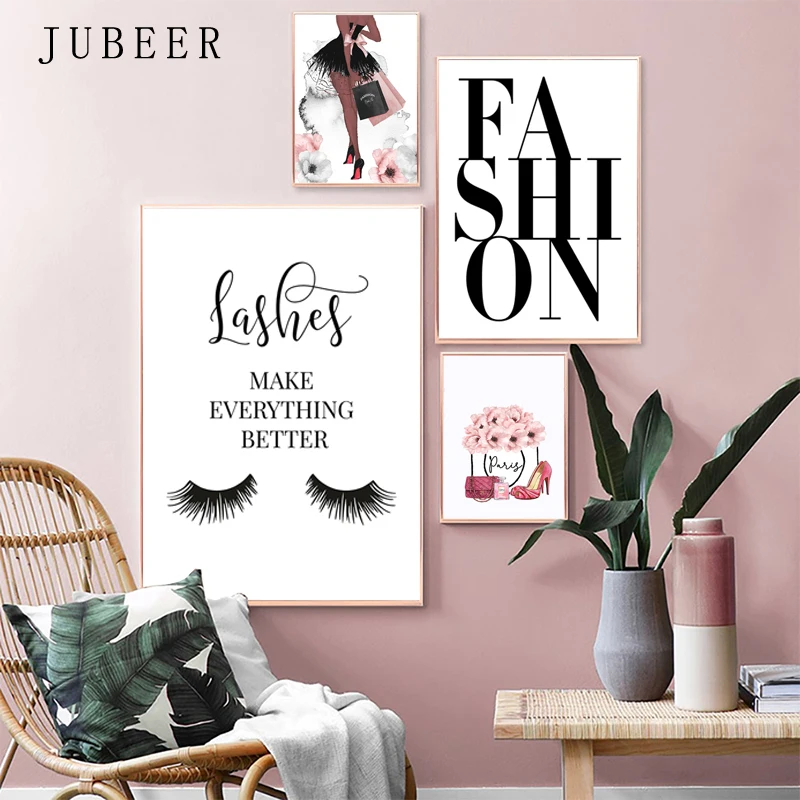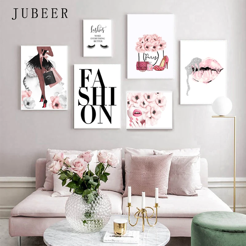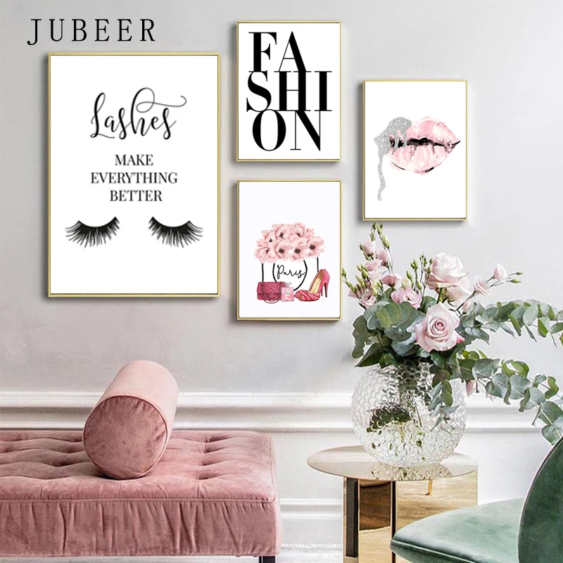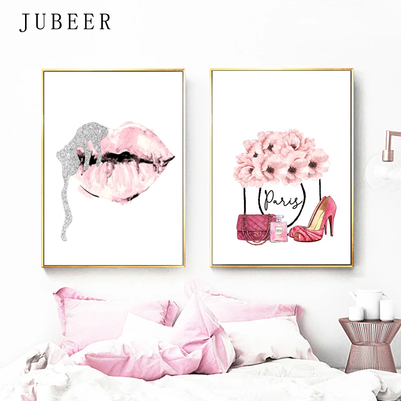 Розовый цветок духи модный постер ресницы Губы Макияж Печать холст Картина Современная Настенная живопись картина для девочки комнаты настенное искусство
